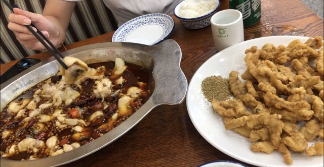 乌干煸鱿鱼须! 觉得他家的鱿鱼须是我吃过的很好吃的 一家了。鱿鱼给的很多而且个头也很大,也很新鲜。乌水煮龙利鱼他家的水煮鱼也很好吃,很入味,鱼肉也很多。 椒盐小酥肉小酥肉要趁热吃,焦香酥脆。