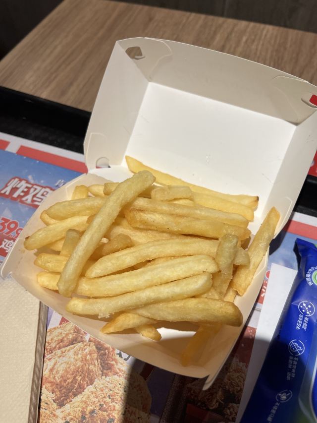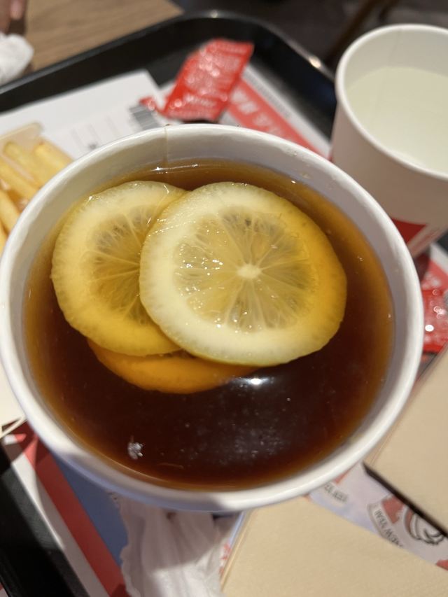 下午来点小食歇歇脚,快餐厅是不二选择。本来想去对面的M,后来一想到柠檬红茶决定在这里休息一下。下午不算饿点了一杯柠檬红茶和一份薯条,记得以前是细的,现在确变成粗薯了,有点类似 某某王了。粗薯条口感也不错新炸的,柠檬红茶也是现做需要点时间,这茶千万晚上不能喝,容易睡不着。白天喝会好一些。现在点餐也方便多了,扫码点餐到号自己取就行。幸好有厕所,水有些喝多了。