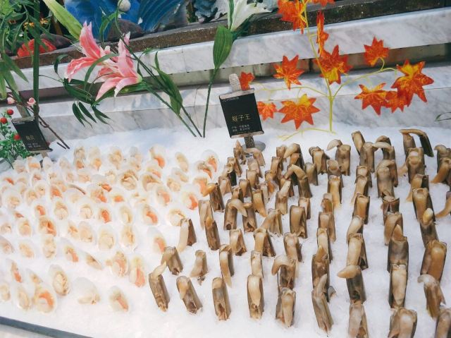 梅花参,金奖蛋挞,渤海鲍鱼,三文鱼,鲍鱼,水果,螃蟹,河蟹,黑蒜烤生蚝,鲜活虾,刺身三文鱼,羊肉串,川骄海鲜自助,蛋挞