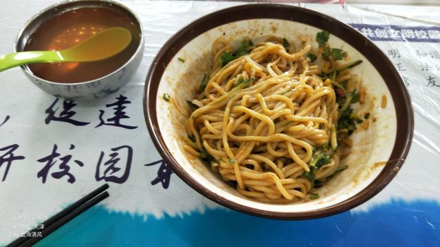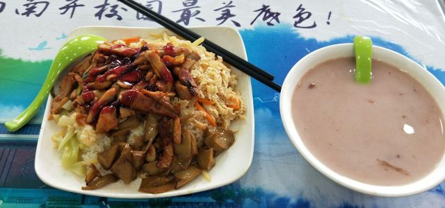 Nankaidaxuesanshitang打卡天津南开大学。跟着南开大学读研的同学去的南开学校食堂。 学校食堂性价比还是不错的,环境氛围好,价格实惠,菜品种类多。 南开三食堂有两层楼,都有各式菜品套餐。 本人在这吃了一份温情蓝莓烤肉饭,价值12元,点了一份红豆八宝粥+椰奶西米露双拼(喝的)大份才3元很便宜,味道都还不错,虽然蓝莓烤肉饭没怎么看到蓝莓酱料。 同学吃的热干面,7元一份,比武汉热干面一般四到五元要贵点,不过他们的分量好像更足够吃,但味道可能并不如武汉本地的正宗好吃。