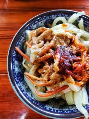 无饭不起早淀粉大法好(二) 一碗呱呱打开了味蕾,开始寻味老字号。 吴大师和常记在一条巷子里,两家各具特色。 吴大师家以面皮见长,浓郁的芝麻酱配上西北的油泼辣子,金黄温润的面皮,筋道柔软,相比我更爱兰州的高担酿皮子。 杏仁茶居然是咸口的,我无福消受。 呱呱是有根的食物,离开天水再找不出。