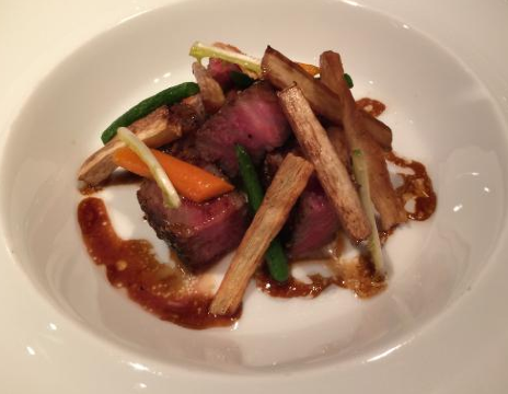和牛,比目生鱼片,油菜花汤,巧克力甜点