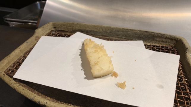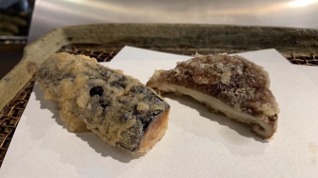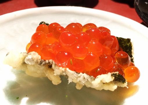新イクラ 海苔の天ぷら,新イカ くちばし周辺 ワタのソース,赤甘鯛,秋刀魚の天ぷら,穴子 ラッキョ塩漬けと一緒に,李子冰沙,天妇罗