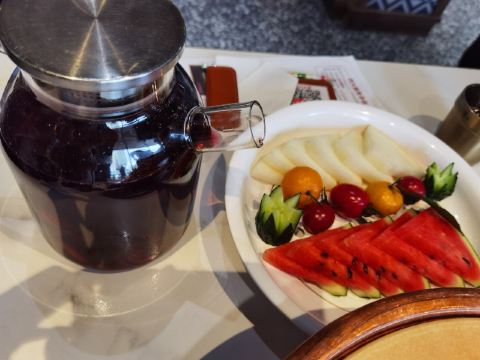 到新疆的第一顿美食,拔草必吃榜的羊肉。 虽然门面一点都不起眼,环境倒还不错。 服务员都很热情,上菜速度也挺快。 卡瓦斯是新疆的特色饮品,酒精含量比较低,可以尝试一下。 沙葱炒鹅蛋:独特的辛香味,很好吃。 炝拌蒲公英:清爽略带点苦味,味道还挺不错。 佛手浇汁袈裟:面皮包裹着肉,很入味,很经饱,一个足矣,不然其他菜就吃不下啦。 羊村手抓肉:羊肉一点也不膻,很嫩,肉也是蛮精的。送的羊肉汤很鲜,很好喝。 阿克苏苹果辣子鸡:里面真得有苹果,还挺甜,就是鸡块有点太小块啦 原始羊肉串:趁热吃,很香,非常不错。 薄皮包子:皮挺薄,还包了一包汤汁,馅也是羊肉的,独特。 罗布人火爆羊肚:这个超爱,相当入味,有嚼劲,非常地好吃。 洛神花水果茶是送的,花果茶里面不仅有洛神花还有各种水果等,味道真得好好喝啊,一定要尝一下。 整体味道都挺不错的。