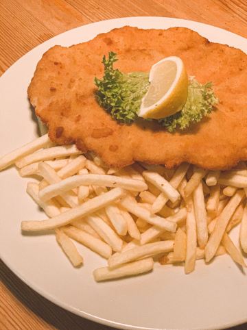 烤肋排,炸猪排,苹果卷,炸牛排,炸土豆片,炸蘑菇,土豆汤,almdudler,巧克力慕斯
