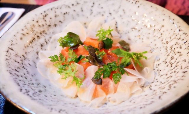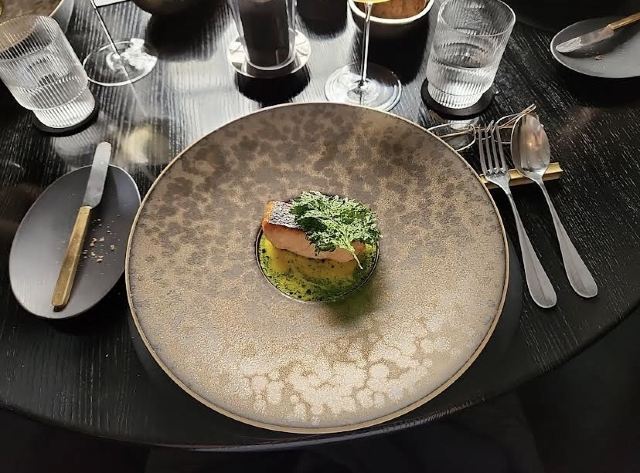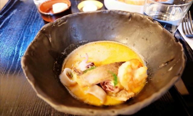 餐厅整体以灰色系装潢为主,餐桌分布非常规整,天花板的流畅线条与侧面窗框相呼应,有种整齐划一的美感。主厨偏爱海鲜食材,在新菜单中加入了大量海鲜菜肴,独特的料理手法与富有新意的烹饪理念使得菜肴总能给饕客带来惊喜,坐在厨师桌旁欣赏主厨流畅的烹饪过程,更是一场视觉盛宴。