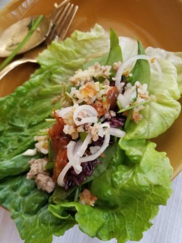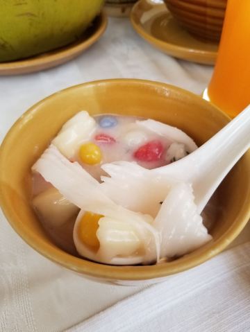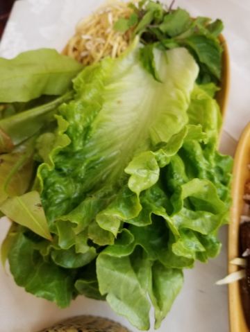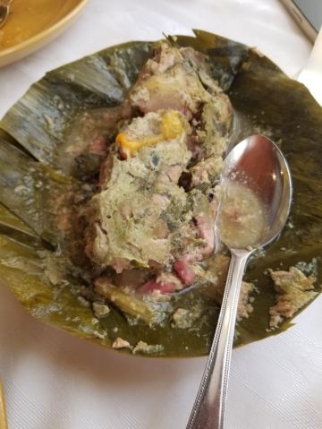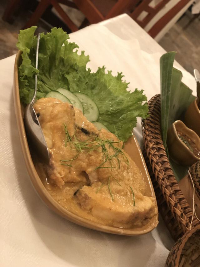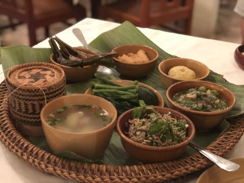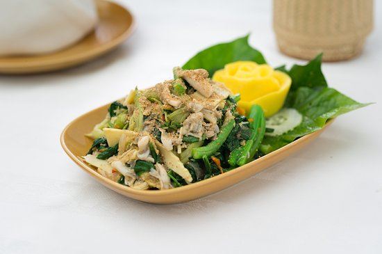 非常地道的老挝菜餐厅,东南亚花园式的格调,不过里面消费较高。烤河苔是餐厅比较特别的菜品,还推荐竹笋汤,与国内菌菇汤的清淡不同,这里的竹笋汤放了很多料,有竹笋、香菇松茸,蘑菇等。添加了香茅草和香料,比较辣。但是味道非常特别,独具老挝特色。