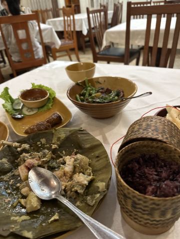 会跳芭蕾色的鱼83280姐妹们!避雷啊!真的这里除了贵和招待过贵宾没啥优点了!也许可以加一个正宗的老挝菜但说实话真的报吃,有些菜太辣了,而且上菜前完全看不出是个辣到感觉食道在灼烧的那种辣度。差评主要就是真的太贵了,我们人均150人民币,虽然量差不多,但因为吃不惯,并没有吃饱饭的满足感,而且里面环境说实话,小飞虫苍蝇也都有,空调也没有很足很舒服,最后结账找钱还给我逆向抹零!5000老币都不找!重点是第二天在洋人街这一带,好多地方都物美价廉,服务也好,坐着舒服,还有驻唱,甚至推荐我菜说这个可以不加辣椒(偷偷说去了一家叫the gallery bistro的小酒馆,老板老帅老帅的,还很热情,还会弹奏中文歌,钱一分不差找回来还不需要服务费