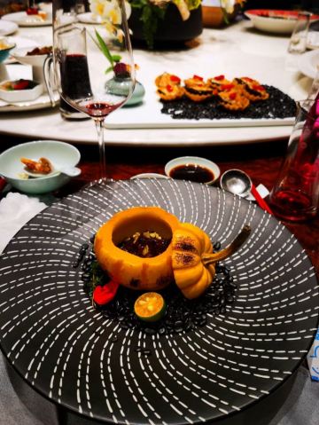 自制酸奶拼慕斯蛋糕,过桥老虎斑,岁岁平安鲍,意酱焗日本鸟取松叶蟹,沙丹妮银鳕鱼球佐宫爆虾球,冰皮鸡,香草法式焗新西兰小羊排,皇家至尊极品萝卜王喂关东辽参,秘制酒香黄鱼,生日面,餐前特选果盘,碳烤俄罗斯松叶蟹六部曲
