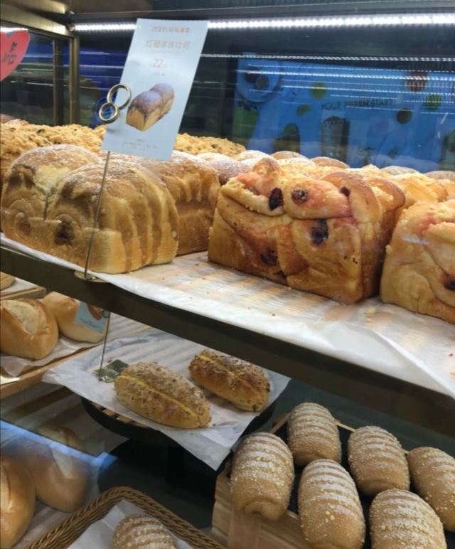 旅游度假最爱巧克力熔岩面包,巧克力面包包裹着巧克力酱,偏甜,三十元一个,价格有点小贵。丹麦红豆吐司面包,上面撒了类似核桃粉点缀,面包里面是红豆醬,面包新鲜,料足,不错。