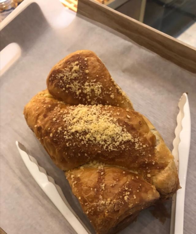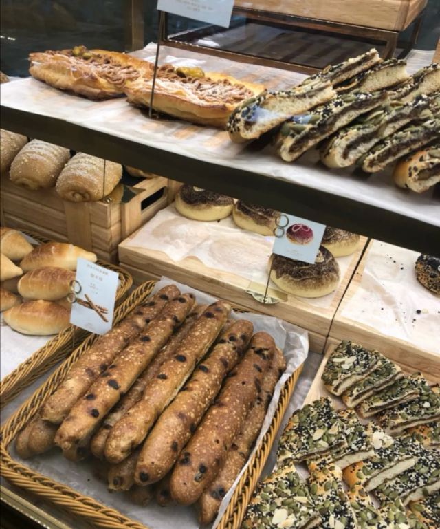 最爱巧克力熔岩面包,巧克力面包包裹着巧克力酱,偏甜,三十元一个,价格有点小贵。丹麦红豆吐司面包,上面撒了类似核桃粉点缀,面包里面是红豆醬,面包新鲜,料足,不错。