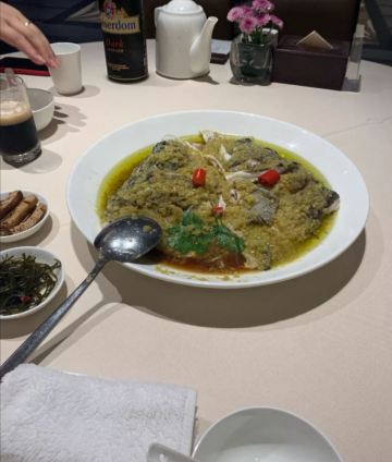 口味鱼头,鱼头上铺满了辣椒,但是不辣,第一口很惊艳,很好吃,加了菠菜面,很Q弹。 农家小炒肉,很迷你的一碟菜,味道不错,基本都是辣椒。 口味小笼包,就是小包子,还不错。 干锅虾,虾炸的很棒,很脆。