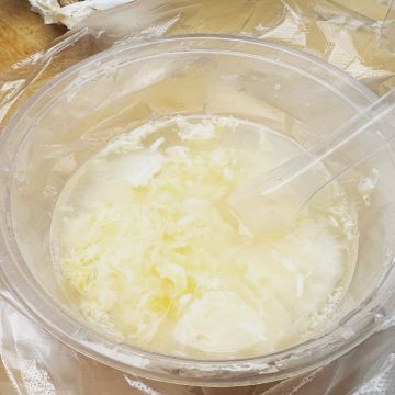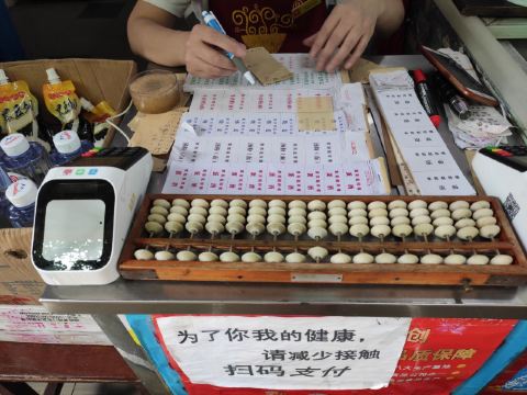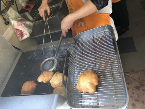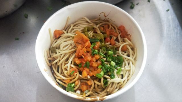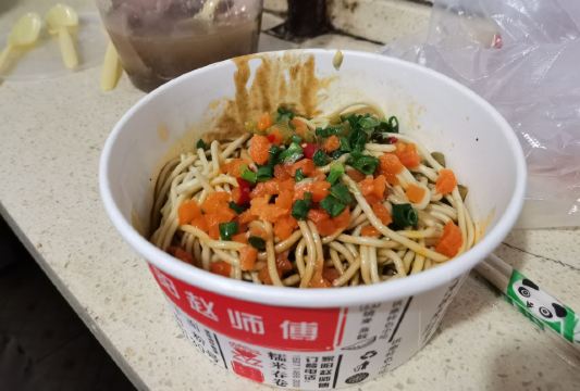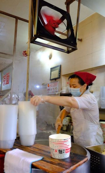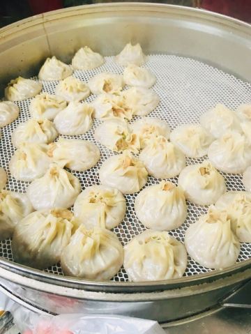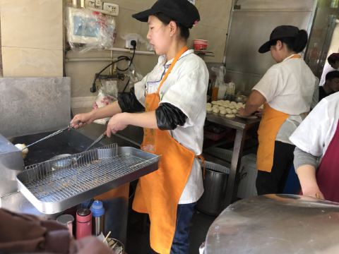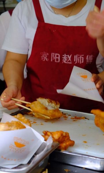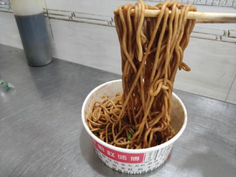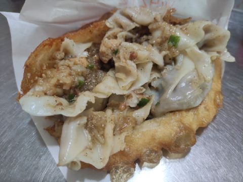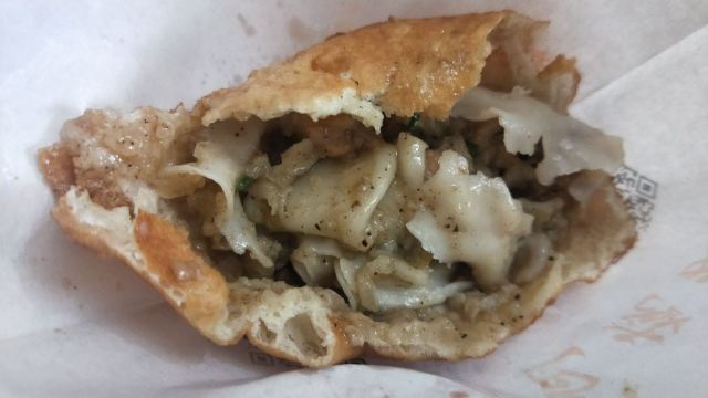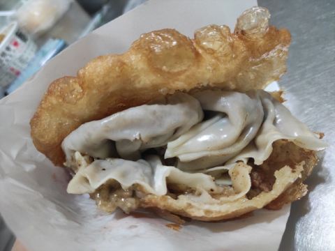 虽然店名叫天天红油赵师傅热干面,但他家有名的绝对不只是热干面,油饼包烧麦人气更甚。热腾腾的油饼现炸出炉,趁热将刚出锅的热油饼切开一个口子,然后将四个刚出笼的烧麦放进去,鼓鼓的一个油饼包烧麦就出炉了。