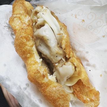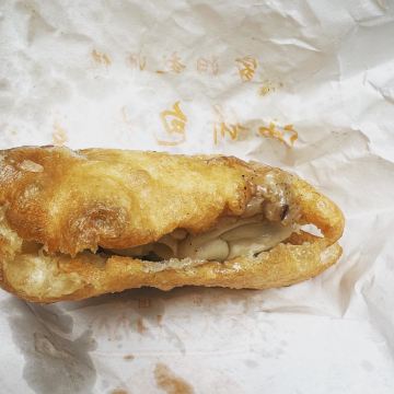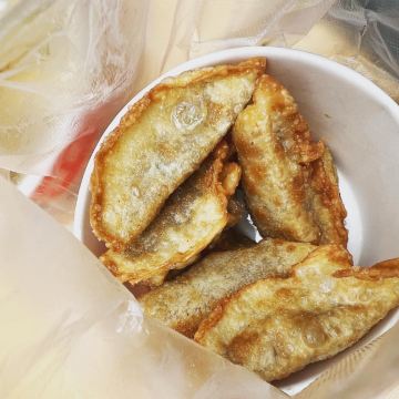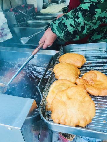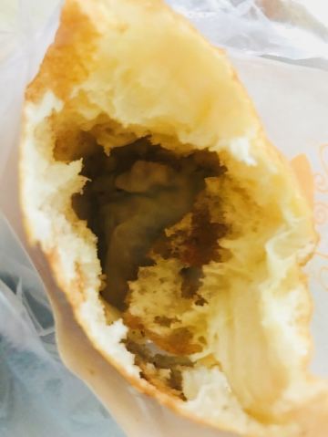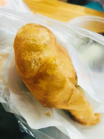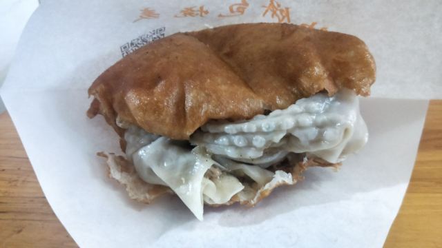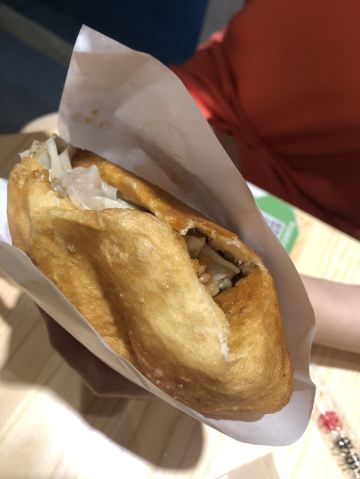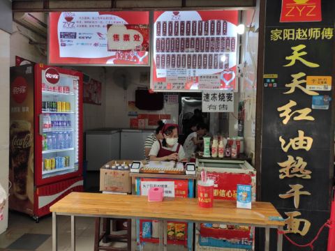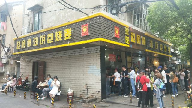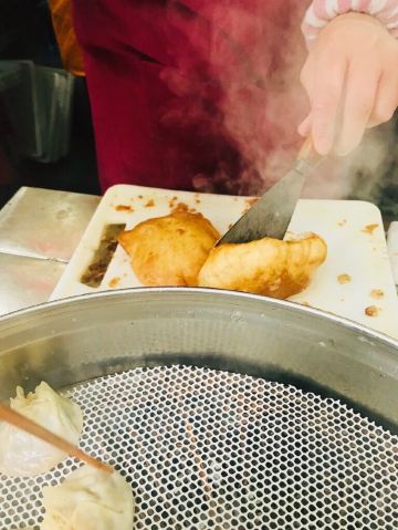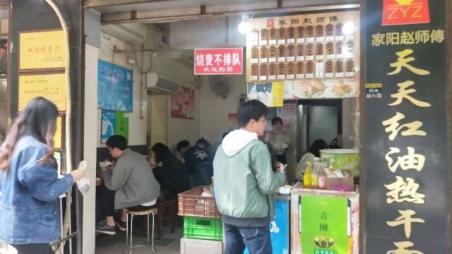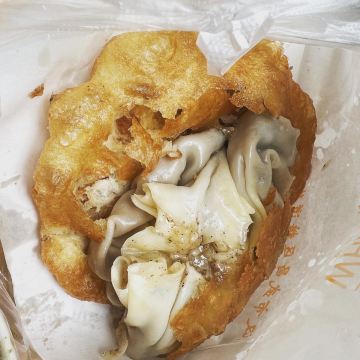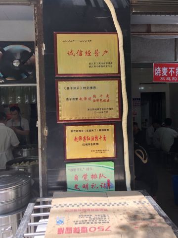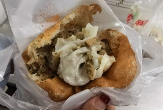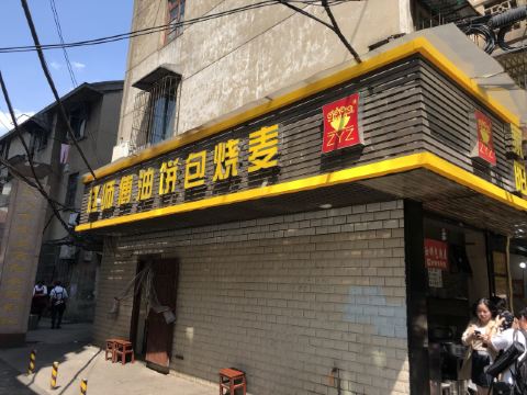 ZYZ天天红油赵师傅热干面,在粮道街上~听武汉的朋友说,这家的油饼包烧麦是他们从小吃到大的产品,假期经过时发现排队排的好长,假期后的第一天中午过去人就没那么多了,赶紧买上一个试试味道~ 油饼还有烧麦都是现做的,油饼现场油炸后切开,包进现蒸好的烧麦,一个油饼里塞了4、5个烧麦~烧麦是有包米饭还有肉的,觉得油饼皮脆吃起来香香的,一个分量十分实在,一个吃完就好撑了~ 总体来说,还不错的一种武汉当地特色小吃~