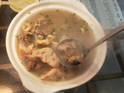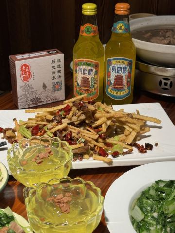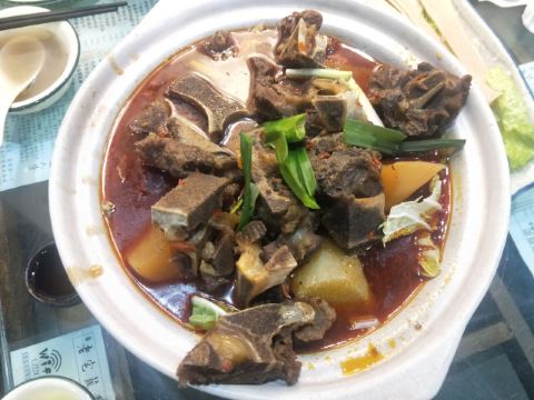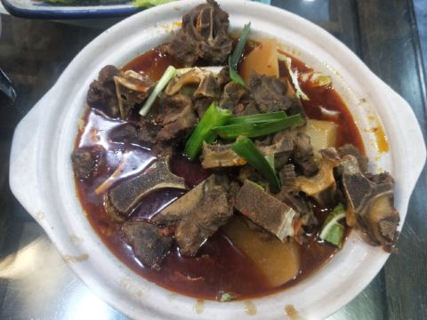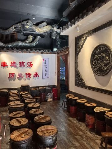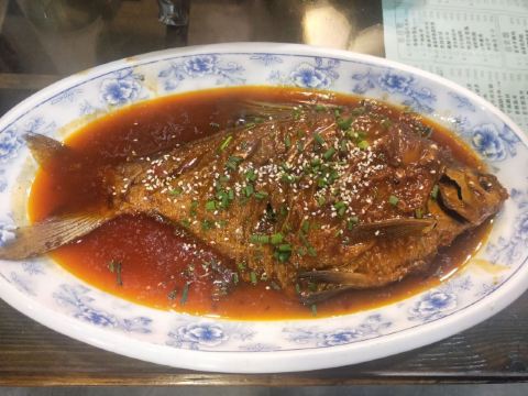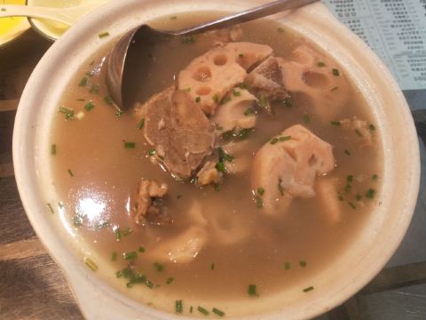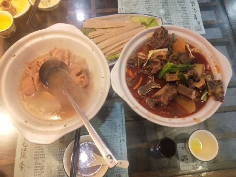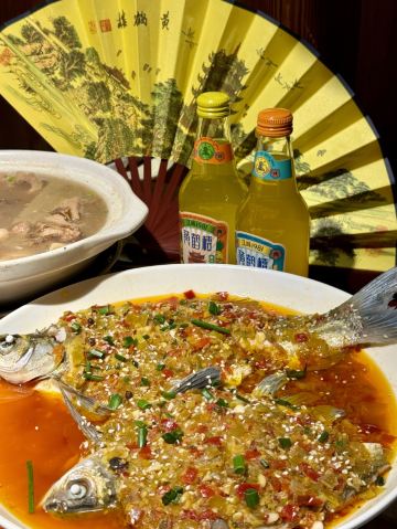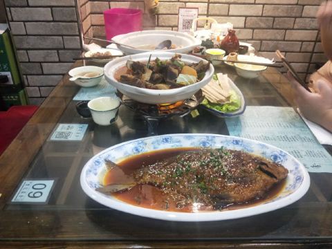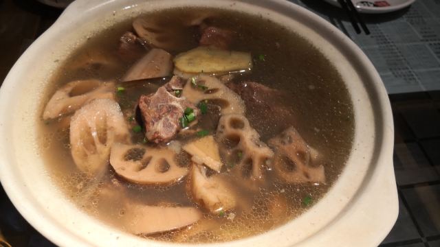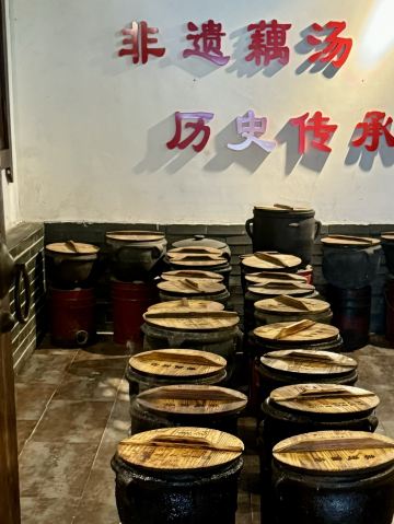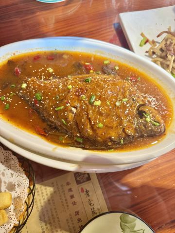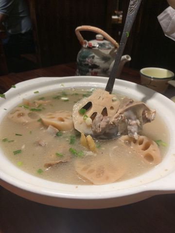 蓝海清风1号店名:老宅藕香武昌鱼(黄鹤楼店)^ 地址:武昌区民主路9号(靠近长江大桥和户部巷) 交通:公交15路到民主路司门口站下 营业时间:上午11:00—晚上22:00 环境: 老宅藕香位于司门口民主路户部巷古街末端。 这里是一座古色古香的老宅子。 装修古朴典雅。荷花吊灯很好看。 有三层楼。设有卡座和包间就餐。 菜品体验: 1【排骨藕汤】 商家招牌菜和当地必吃菜。 一大盆的排骨藕汤分量充足,有大块粉藕和排骨肉。 莲藕软糯糯的,能拉出丝,吃起来比较香甜。 清汤浓郁,喝起来鲜美爽口。 2【牛骨头】 牛骨头煮的软烂,肉容易脱落,吃起来方便。 下面有白萝卜和白菜打底,香辣汤汁更加入味。 3【红烧武昌鱼】 武昌鱼在清蒸和红烧中选择的红烧武昌鱼。 武昌鱼上面撒了白芝麻和香葱,底下鲜红汤汁浓稠。 鱼肉口感细腻,品尝起来感觉鲜嫩唯美。