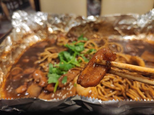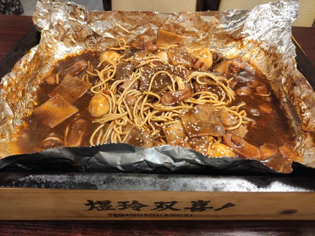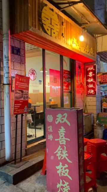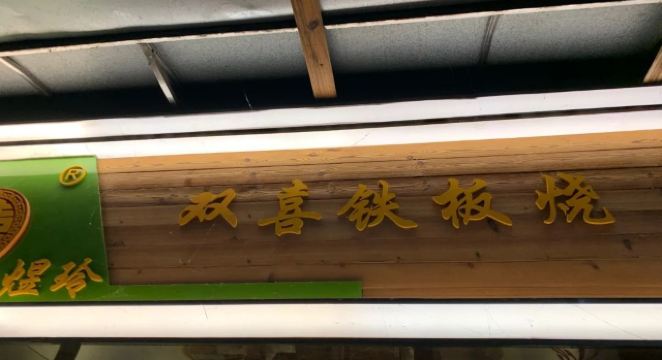 店名:双喜铁板烧(东湖村总店) 地址:八一路东湖新村96号底商 营业时间:中午10:30-14:30,晚上16:30-21:30 【环境】 这家店靠近武汉大学后门,在一条小巷子里,是一家网红铁板烧店,至今已经营八年。这边有两个门面,斜对面东湖村99号去时是没人的,说是人多坐不下时那边也会开。 店里往里走可以看出有两块就餐区域,有四人卡座,还有小隔间沙发座,属于苍蝇馆子的环境但装修布置的也还可以。 本人在这点了一份铁板牛肉套餐,价值39元,是店里外卖销量最好的套餐。这份铁板烧里含烤牛肉、热干面、脆皮肠、千叶豆腐、包心鱼丸、香菜这些菜品内容,上面有白芝麻点缀,底下是秘制现调酱汁,米饭和柠檬水可以免费加。 【口味】 铁板牛肉是招牌推荐,烤过的牛肉吃起来很嫩且有嚼劲;脆皮肠吃起来香脆入味;千叶豆腐比较软烂;包心鱼丸切成半块样子较小;热干面分量很足,吸收了酱汁后的热干面味道很赞。 【服务】 店里服务还是可以的,入座自助扫码点单,服务员会帮乘饭,帮加水。