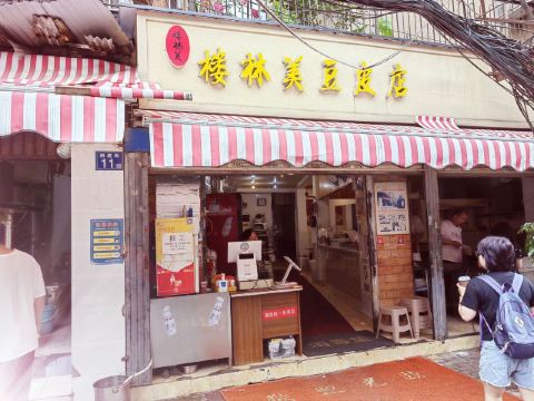 楼林美豆皮店,地址武汉洞庭街11号。 🚗交通 武汉地铁二号线江汉路C出口 🏖️环境布置 楼林美豆皮店,武汉十年老字号小吃店。深藏于江汉路旁的小巷之间,闹中取静。环境简陋而油腻,市井烟火浓郁,却让人感到满满的亲切。墙上挂着老照片,开放式厨房,食材新鲜现做。市井间的地道热干面,游客必来打卡。 💁服务态度 超实惠的小店,桌子来不及收拾,餐具也是一次性的。纸巾是墙上挂着的卷纸,服务热情是算不上的,不过出餐真的很快,味道也不错。 🍜美食推荐 |热干面^只要5元,热气腾腾,喷香油润。 香葱、肉末、酱油等,各种香气扑鼻,鲜香入味。|小菜^也是免费自助,随便加,口感真心地道。 |楼林美豆皮^豆腐皮包裹着糯米,里面还夹着肉末,料真心足,很有饱腹感。我们最后一天临走时还专程打包,在高铁上吃也是香喷喷的。 📌贴心TIPS 营业时间:6:00-14:00 楼林美豆皮店,武汉市井间的地道热干面。