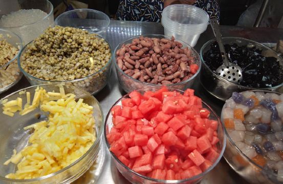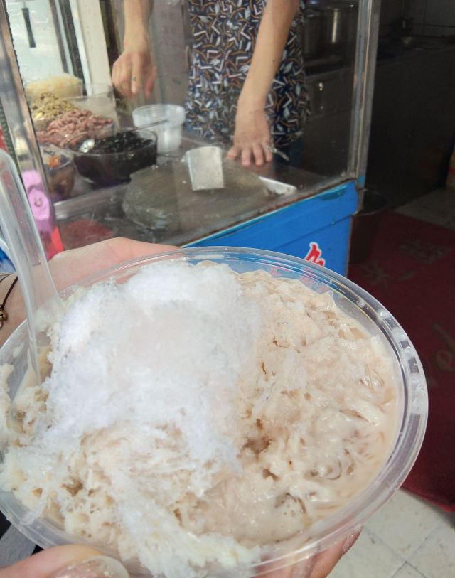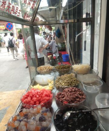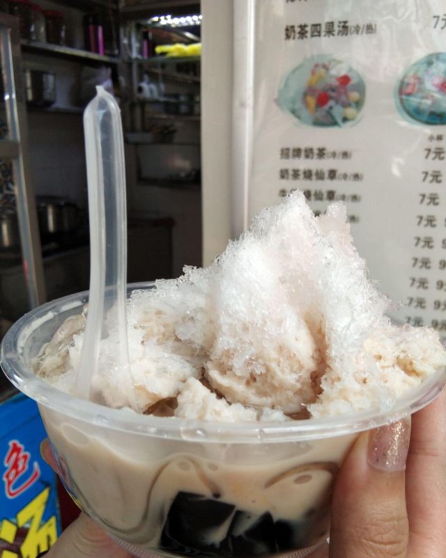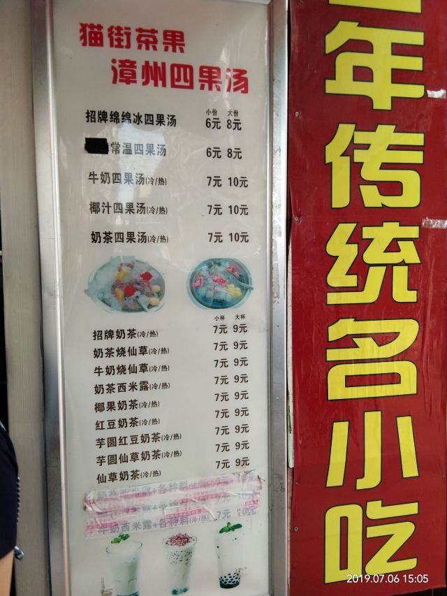 暑假之行第一站--厦门 厦门的美食真不了解,早早看中了四果汤,收藏好等待拔草[拔草] 靠近厦门大学,旁边小路上,去的时候刚好没啥人,不用等多久。 环境就是路边小店,很小的店面,卫生一般般 配料十余种,口味选择多,大小份之说。 奶茶四果汤,冰冰凉,那么炎热的夏天,顿时清凉好多。里面加上陈皮,吃不习惯,其他都很满意的