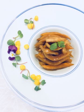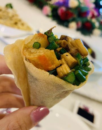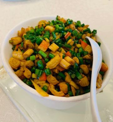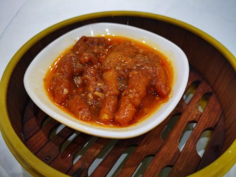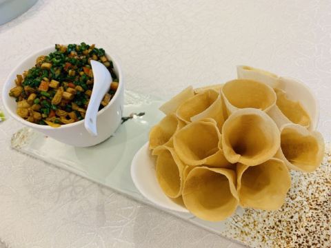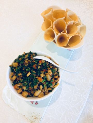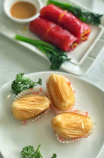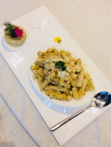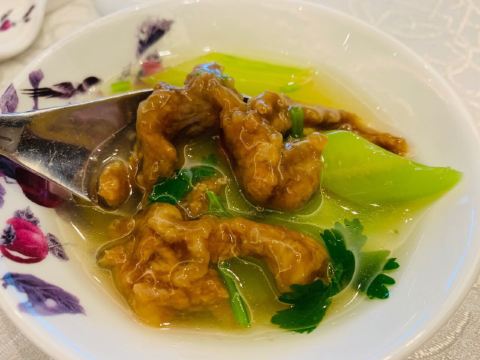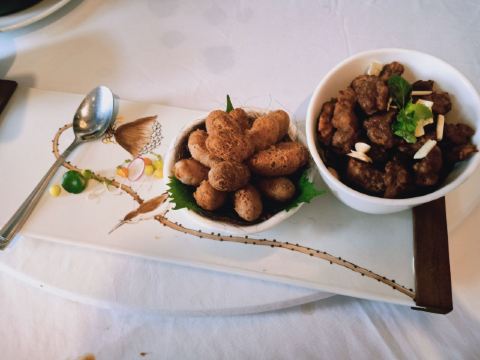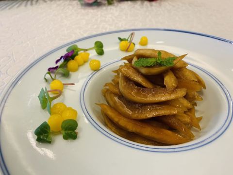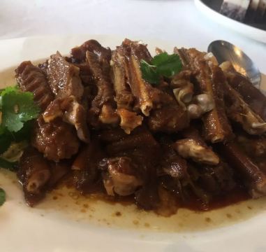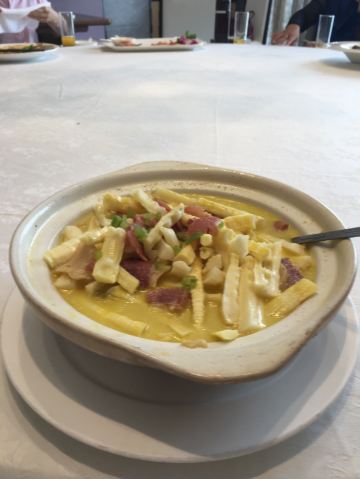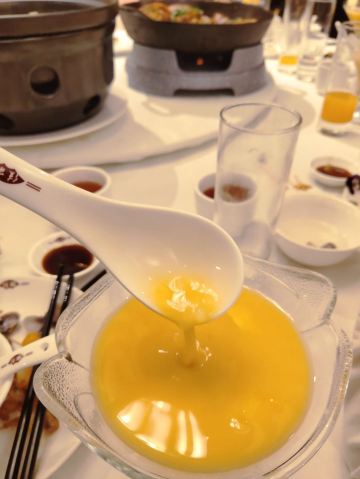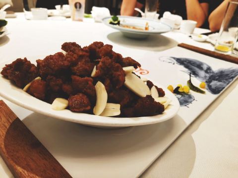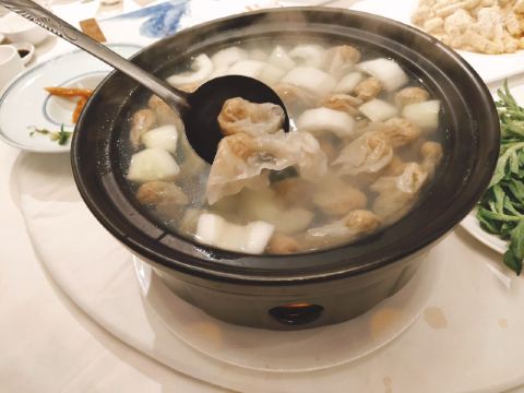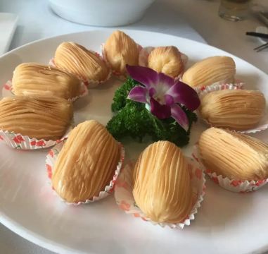 轻轻的一个蚊在厦门是属于老牌酒楼的佳丽,做法地道,口味稳定。 餐前的小点椰汁红豆糕马上吸引我们的眼球,上层白若凝脂,下层软糯适口,整体极为清甜冰爽。颜值高又极为可口。而鹌鹑蛋的「迷你黄金蛋」浑圆可爱。 「双椒蒸龙胆鱼」藤椒的辣椒的双重加持,龙胆鱼的细嫩鲜美马上体现出来。 极为考验刀工与炒工的「蟹肉茭白笋」深得我胃,切得细细长长的茭白笋,和着蟹肉丝,茭白笋的清爽和蟹肉的鲜甜何在一起,干吃或者下饭都是极佳的。 「招牌肉羹汤」芥菜清爽,汤汁浓稠欲滴,那肉羹入口微微酸辣,口感顺滑,味道独特,极为鲜美。 有鹅掌鸭掌组成的「尾翅双飞」卤味十足,口感黏口,撕咬感十足,胶原蛋白质满满。 热炒北极贝,口感脆爽, 素炒小黄瓜,细嫩可爱的小黄瓜脆爽可口。 「酸汤肥牛」汤汁酸爽宜人,令人大开味蕾,牛肉大片又细薄,连粉丝都很棒。 两个很地道的菜值得推荐,一口酥芋枣外表金黄,内馅软糯,甜蜜客人,五香外皮酥脆,内馅香甜,肉馅实在,口感满足。 饭后来份唇齿留香的榴莲酥,妙不可言。