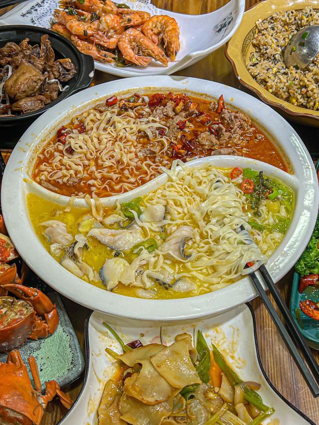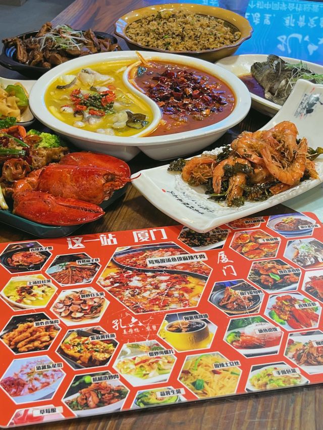 蜜桃浪味仙在厦门!感谢本地人推荐。。。。。 每次逛完环岛路都要来吃的平价海鲜,藏在巷子里没本地人带路根本找不到,人均不过百,海鲜都是海鲜池里现捞现做,到饭点生意好好高峰时候还要等位,除了海鲜还可以吃到特色闽南菜,很适合来厦门旅游的宝子们~ . ✔️干煎膏蟹(每桌都会点!螃蟹个头很大,满满的蟹膏膏黄,里面的蟹肉也很扎实,都是海鲜池里现捞现煎的,太美味啦,要趁热吃~ ✔️麻辣牛肉青花椒鱼面 (像是吃鸳鸯锅一样,还多点了一份面条,吸满汤汁的面特别入味,麻辣牛肉很嫩,鱼肉口感也很好,简直是双拼的快乐🥳 还有闽派佛跳墙、福建观音虾、姜母鸭味道都很正~ . 🦀️:孔六丨香煎蟹姜母鸭·福建菜