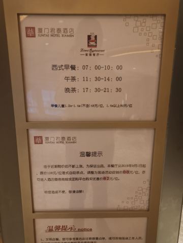 古月初夏厦门自助茶点 | 君泰翠华厅就餐测评 菜品口感 ✘燕麦海参肠:上桌是冰冰凉的; ✘四包蒸鱼唇:里头只有鱼肉没有鱼唇; ✘蟹子鲍鱼饺:蟹子很腥、虾饺皮很甜很硬、内里只有香菇没有鲍鱼; ✘冰心青柠檬:外皮是极甜的巧克力,内里是极甜的奶油搭配极酸的青柠蜜; ✘鲜鸡枞菌灌汤包:稀碎的肉末加大颗大颗的蒜粒; 📌用餐环境 二楼翠华厅,室内满了会被安排到室外走廊就座,不能选择位置,由前台分配; 📍用餐小贴士 ●定好前去时间至少提前2~3天,周末的话至少提前一周预约,当天100%预约不到; ●建议在第一次下单时就直接点完所有想吃的,因为如果加单,等1小时以上是打底; ●每桌有2000rmb点单上限,若较多人想做同一桌仍然是2000上限,不划算,建议分桌座; ⭕服务 一人一盅的炖汤卡片没给,询问后,说好,到吃完也没给; 就餐过程中催菜不下5次,服务员明显是忙不过来的状态; 二人桌位置很小,全程无人更换餐碟; 继2015开业,二刷君泰茶点,就餐感是从天堂到九层地域的级别,其实不太明白贵酒店做如此低的价格,可能不zhuan 💰不说,把餐品、服务、做成这样,着实是在砸自家招牌。。