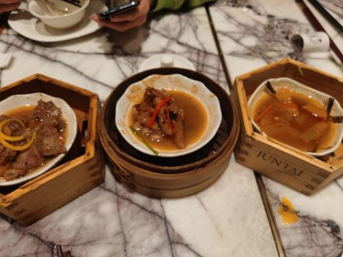又来君泰次茶点啦~始终觉得他家是厦门性价比最高的自助茶点,这次也没让人失望 文兴西路 就餐免费停车4小时 紫薇厅就在一楼,面积蛮大的,设位不少,但不拥挤,很适合朋友小聚饮茶聊天 半自助式,自助区有水果、甜点、主食、小食,杨枝甘露依旧好喝! 每个人限量一份瓦罐汤,调味有点太重了 牛仔骨、金钱肚、排骨必点!很好吃,这种时候不限量就超幸福!虾饺和烧卖就及格线,榴莲酥比什么榴莲饼和榴莲糕好吃!请避雷!新出的几款蛋糕也不错吃,巧克力的外皮很硬,敲碎它的过程很好玩,还有小白兔可以玩! 服务员都蛮积极的,上菜也不慢,还有现场的小提琴表演,格调