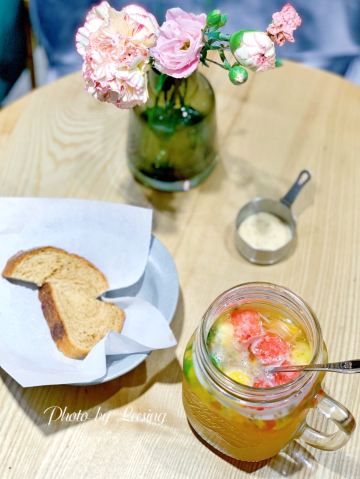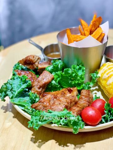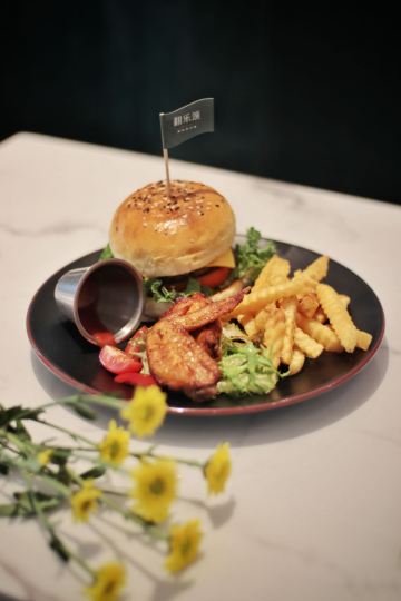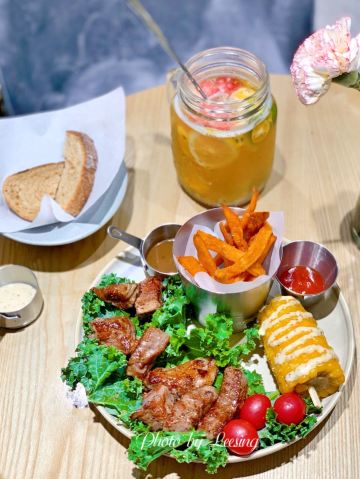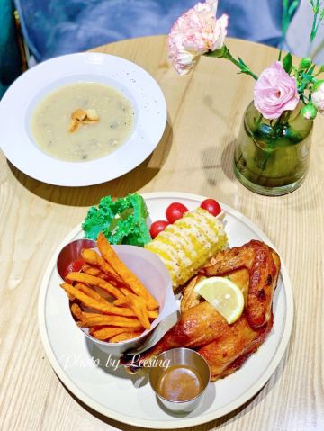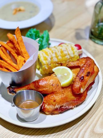 Leesing小歆一眼就看中翻乐烤鸡套餐,想想要吃到的时候都小开心,烤鸡等得会稍微久点,上桌着实诱人,虽然热乎,但是忍着热开始对它进行拆分,酱汁的味道完全融入到了鸡皮,好吃,可是莫有渗入内在的肉肉,肉肉无味。 相比翻乐烤鸡套餐,小歆还是更推荐翻乐牛排套餐,虽然不是什么多好品质的牛排,但至少它足够柔嫩,味道也不错,更加推荐。 不论是翻乐烤鸡套餐还是翻乐牛排套餐,都标配了薯条、玉米棒,薯条是红薯制成炸的,家的手法;玉米棒采用的糯玉米,很软烂,不是太喜欢。 喝方面,小歆点了鲜果茶和蘑菇汤。鲜果茶分量很足,超大一杯,还不错喝,很解渴。蘑菇汤大写的不推荐,应该是喝过最难喝的一次蘑菇汤了吧,口感差,口味差,像是白水兑了一点牛奶,拌入水煮过的碎蘑菇一般。