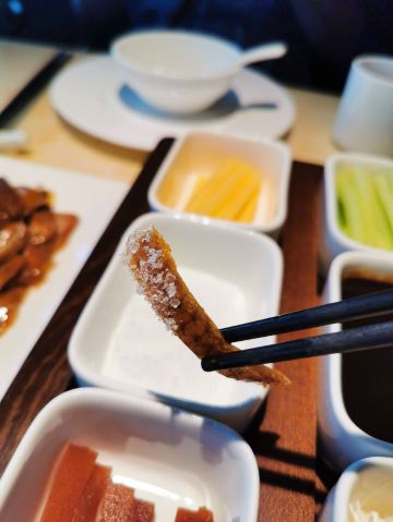 大肚小象“有朋自远方来,不亦乐乎?” 朋友好不容易来一趟厦门玩,自然是要好吃好喝的款待,她订了会展附近的酒店,刚好,请她来非常高大上的JFC吃超级赞的烤鸭,提前约了时间,以及上菜的时间,忽然就觉得很有仪式感,连带朋友也觉得很期待。 提前了10分钟到店,落座后问我鸭子马上就要烤好了,可以按着约好的时间上吗?第一次吃这么新鲜出炉的烤鸭,看着厨师推着车子到桌边现场片鸭肉,鸭皮烤得真的非常酥脆!!沾白糖吃真的很香甜呀,抿一抿都化开了。鸭肉沾甜面酱,加京葱丝,青瓜条,用很薄但劲道的烙荷叶饼裹起来,老北京烤鸭,就是这个味! 另外点了金汤黑豆腐,焗东山小管,豆腐真的很好吃,超级嫩,有豆子的香气,装在沙煲里端上来还滋滋的沸腾,一直到最后都很保温,豆腐慢慢吸收金汤,越来越鲜甜。东山小管膏很足啊,吃起来粘糯丰腴,朋友惊叹从来没有吃到这样的小管,那是,毕竟也算是本地特色菜了,朋友喜欢就好,这一顿饭宾主尽欢,想必这一次的相聚,也将会成为朋友心心念念的美好回忆吧。