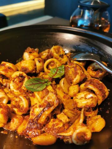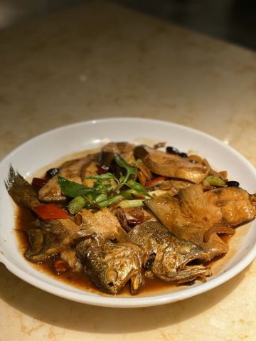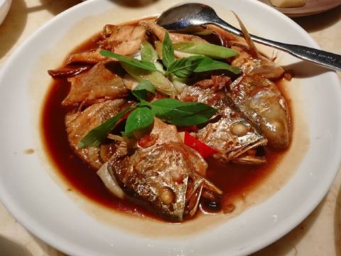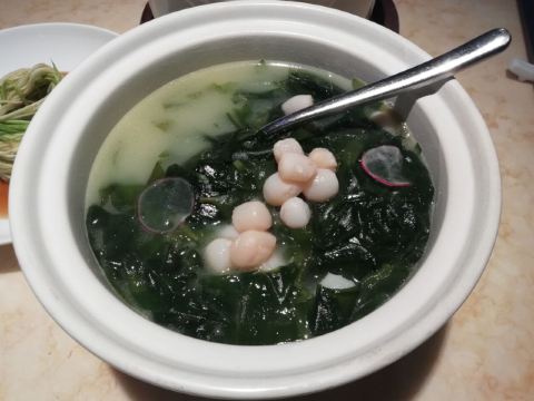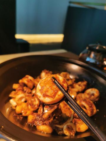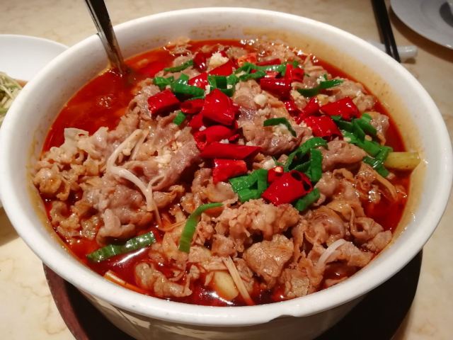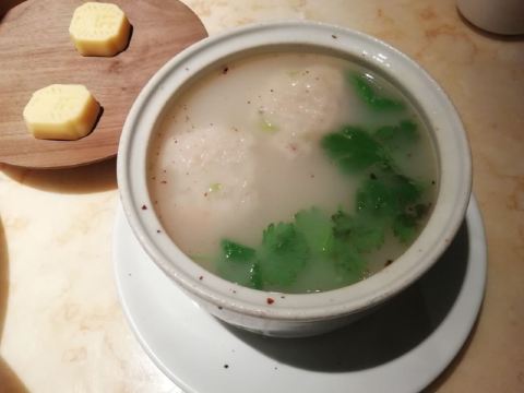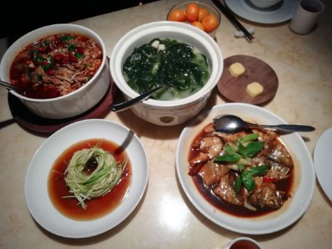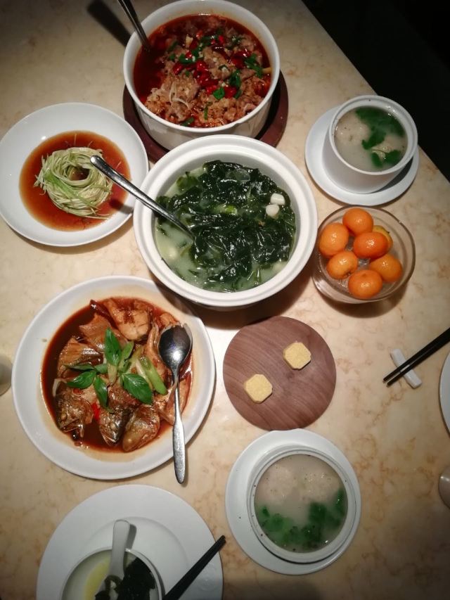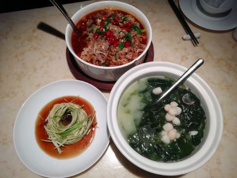 D调的华丽转身上饍,位于JFC品尚中心B栋四楼,占地面积很大,承包了一整个楼层,中午过来它家用餐,客人不算多,环境很好,有点小资浪漫,柔软的沙发卡座感觉很舒适。 大家的菜品挺精致的,摆盘好看。 水煮安格斯牛肉,味道比较辣,上面比较厚重的红油,不过开胃下饭。牛肉的份量很多,底下有金针菇和莴笋为辅菜,好吃不腻。 油醋小瓜丝,切的很细,有点像面条,口味酸甜可口,口感清脆,有一股淡淡的芝麻香气,做开餐小菜最合适。 胡椒奶白海鲜狮子头,很有特色的一道汤品,胡椒味辛香浓郁,汤头乳白,狮子头里除了传统猪肉外还加了虾仁和鱿鱼,口味更丰富。 海鲜组合酱油水,类似于酱油水煮杂鱼,不过鱼肉没什么骨头,免了剃刺的烦恼,酱油水用来浇五常大米太好吃,连吃了两大碗米饭。