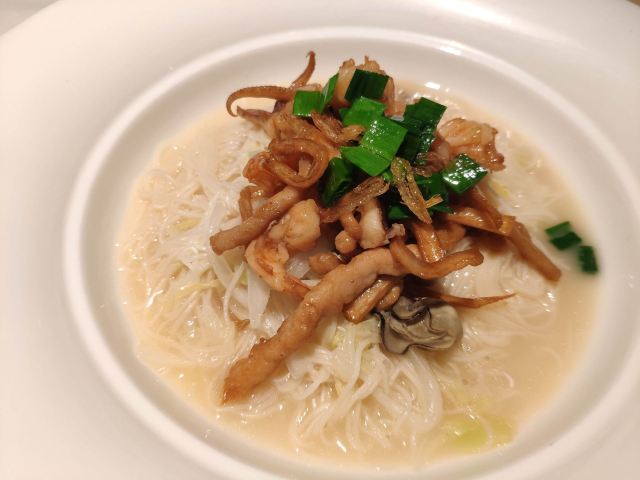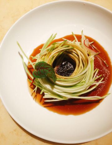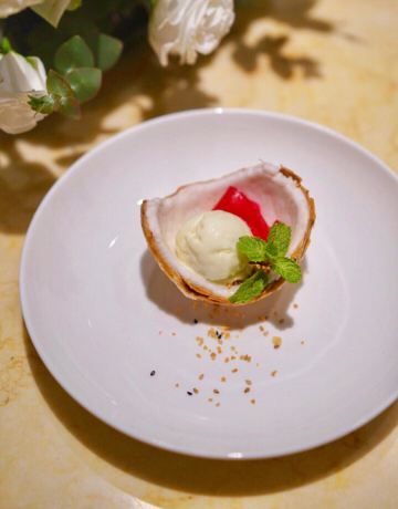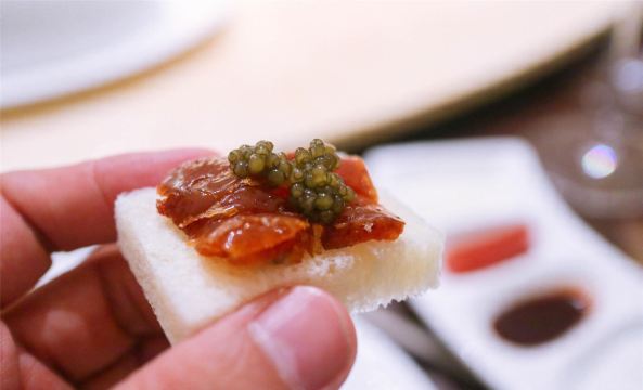 番茄看世界初认识这家店是以肥硕喷香的烤鸭出名,名副其实的老北京吊炉烤鸭,竟然需要预定才能吃上,现烤现吃!现做现切! 他们家不只有烤鸭,针对时季,推出了不同的主题套餐,例如今期的“浮暑最清风”清凉特色全宴。 上饍中国厨房位于JFC。电梯入户,漂亮小姐姐引进座位,餐厅舒适静逸,宽敞且格调典雅。 不逊色于高档现代西餐的同时,一些国风摆设更添几分温文儒雅。 第一道前菜为翡翠香芒双味卷,一绿一黄加上小嫩叶宛如国画一般,柔软的面皮下包裹着香甜的芒果与艾草,口感细腻,爽口清凉。 第二道前菜为荔枝伊比利亚火腿沙拉,改良自经典南欧风情菜肴,采用伊比利亚火腿沙拉做法,在果蔬中替入更珍贵的岭南荔枝,整道沙拉也是香甜可口、解馋开胃。 独特的汤品非粥水翅珍贵妃蚌莫属了。壶底铺满贵妃蚌、鱼翅与丝瓜,将浓稠的咸粥浇淋生烫,再撒上淡香的木槿花瓣。保持贵妃蚌和鱼翅的新鲜的同时,还去除了海鲜的腥味,淡而清甜的口感瞬间然人遗忘夏天的炎热。 以吐司面包为基底,铺上烤到金黄的烤鸭皮,最后以名贵且口味奇特的鲟鱼子酱筑顶,一口吃下,由松软到香脆,带有鲟鱼子酱的咸劲。好吃到爆! 经过不断的尝试,上饍人发现马龙琴酒庄干红葡萄酒,与上膳中国厨房的烤鸭是最佳的“酒伴”这款原产于法国波尔多酒区的红葡萄酒馥郁的芳香,口感紧凑顺滑,能带走烤鸭中的腥腻感,让鸭肉的香味更加醇厚。 一边是台湾最具盛名的莲雾,饱满多汁,清甜可口。一边是炸到酥松的鳕鱼排,松脆爆香,细嫩丝滑,外加大厨现场焊枪烹饪。这就是台湾莲雾桑汁焊鱼排了,而这份精致的菜肴最出彩的如瀑布一般流下的桑叶汁这可是用新鲜桑叶熬制而成的,非常独特! 别小看这份袖珍的奶黄酱娟雪花牛肉,牛肉嫩到不行,烹饪的时间把握的恰到好处,咬下去鲜嫩多汁,奶香味十足。满口都是幸福的味道。 主食除了米饭,这道面线可是极力推荐,用黄鱼熬出乳白色浓稠的鱼汤,煮面线!闽南人都懂的鲜甜!仔细看,黄鱼肉上还有点点虾滑,养胃、解暑又美味。 餐后呈出的甜点是大、小朋友都喜欢的冰淇淋,而这道冰淇淋单看外形就让人爱不释手,不规则的椰子壳做容器,美味舒爽的冰淇淋能隐约品出姜汁的香味。偶尔发脆的是花生碎的作用,一勺一勺吃完整个冰淇淋依然意犹未尽,直到将椰壳内的椰肉一网打尽才能收手。 上饍中国厨房(建发JFC品尚中心店) 坐标:厦门环岛东路JFC品尚中心B座4楼