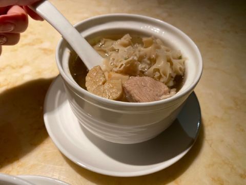 SHANG SHAN ·ZHONG GUO CHU FANG(JIAN FA JFC PIN SHANG ZHONG XIN DIAN)厦门探店|上饍冬日甄选|香浓的羊肉汤暖身暖胃 👉【特色】以“尽善尽美,闽粤融合”为为品牌理念,主打地道闽粤菜,各款山海鲜食。根据季节推出不同主打菜系,招牌烤鸭每桌必点。 📍地址:环岛东路JFC品尚中心B馆4楼。 🕐营业时间:11:00-14:30,17:00-21:00。 🏝环境:高端大气上档次。暗色调使人放松。就算是二人座也很宽敞,皮质沙发坐的十分舒适。 🍽【推荐美食】: 🛎 #滋补鲨鱼丸羊肉汤配油条# 冬季推出的新菜之一。以小火锅方式呈现。肥而不腻带皮的东山羊肉,闽南特色的鲨鱼丸,想不到二者搭配激发出独特的味蕾体验。汤奶白香浓美味。羊肉蘸点搭配的腐乳酱汁特别好吃。鲨鱼丸劲道Q弹。还有丰富的配菜,白萝卜、淮山、玉米等,饱吸肉汤,也格外美味。 油条是现炸的,端上来还热乎乎,会贴心帮忙切成小块,趁热赶快单口吃一个,酥香脆。亦可泡羊肉汤吃,吸了满满的羊肉汤,太美味了!推荐必点,寒冷的冬日一吃就暖和起来的菜。 🛎 #杏香烟熏带鱼卷# ✨不看菜单我根本看不出这是带鱼卷,摆盘特别惊艳。带鱼去了骨炸的外酥里嫩,蘸点糖霜,既有海鲜的咸香又有蜜汁的味道,丰富的口感我很喜欢。 🛎 #油醋有机小瓜丝# 开胃凉菜,酸甜度把握得恰到好处。瓜丝非常脆嫩。 👍服务非常好。从进门就感受到五星级酒店般服务。还有赠送餐前水果和点心。在这里吃饭是一种享受!
