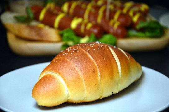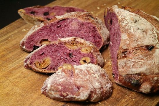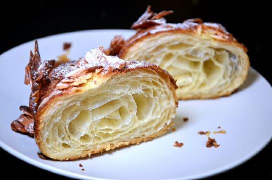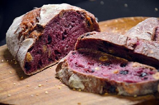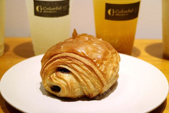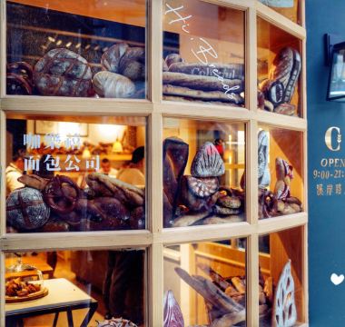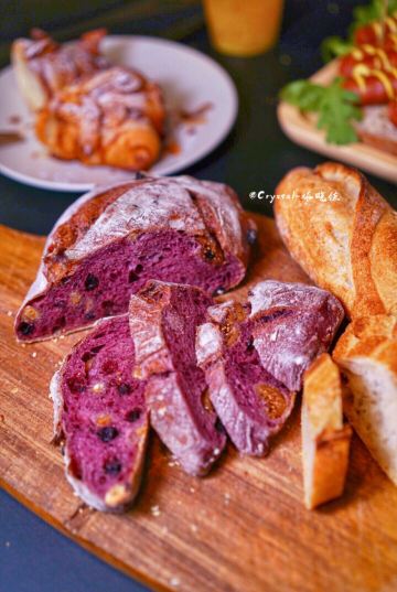 锐天气闲来无事,漫步于溪岸街花鸟市场,不经意的一瞥,发现在众多老房子中,竟有一间欧式风格的面包店,名字也有趣——“咖乐禧面包公司”。 夜幕降临,店里照出暖黄灯光,不禁推门而入,室内陈设简约大气,象牙白、原木色为主调。 各式面包盛装在竹篮里,迎面而来的是淡淡的麦香,听店员说这些软式面包当天做当天卖,卖不完的只能扔掉。听闻此言,心中有些惊讶。 黑醋栗洛代夫,洛代夫是指一种法国主食面包,是无油无糖的欧包,不过含水量达到88[%],并且添加了新西兰进口的100[%]黑醋栗粉,还有无花果、烤香榛子仁、蓝莓干,外皮较脆,内里柔软有嚼劲。 巧克力可颂,法国进口巧克力棒在高温下,与可颂面团互相交融,那份细腻甜美,做为一个巧克力控,完全无法抵御。