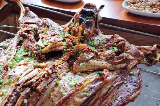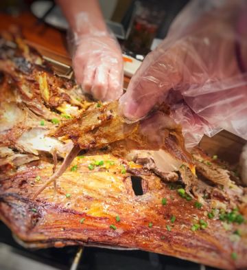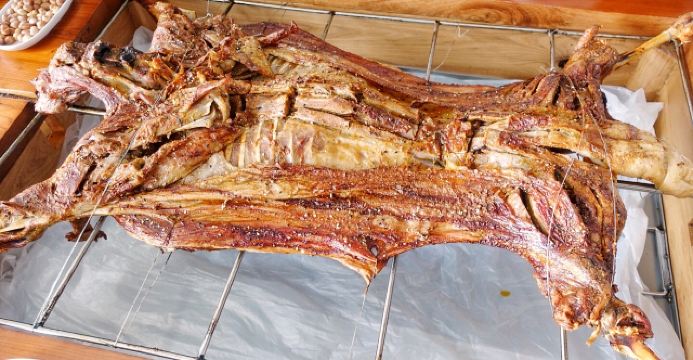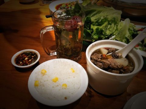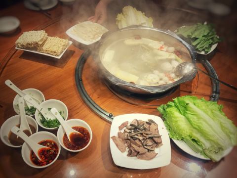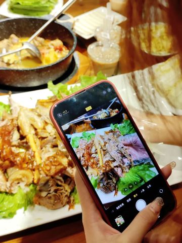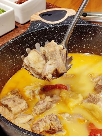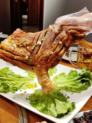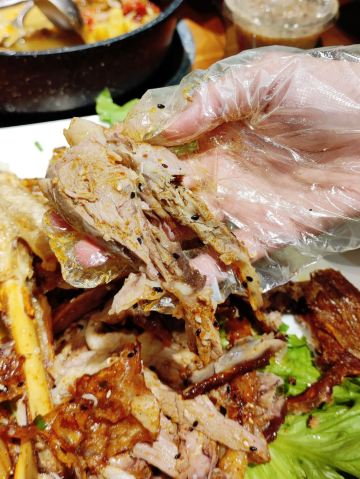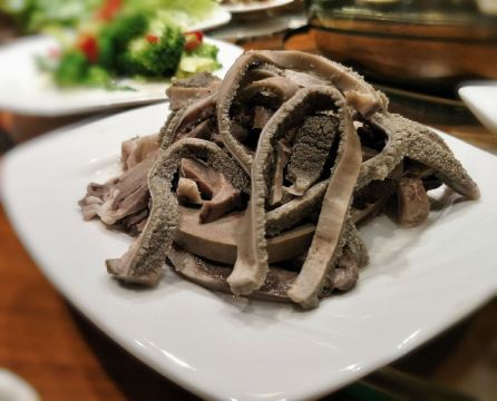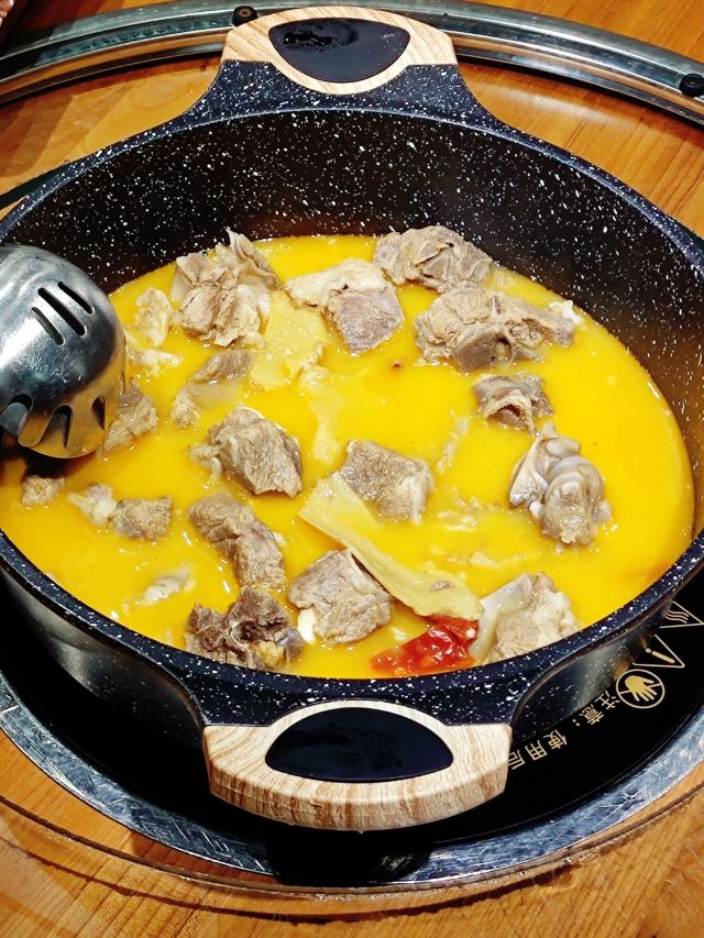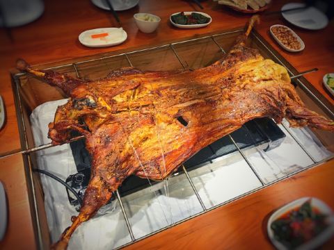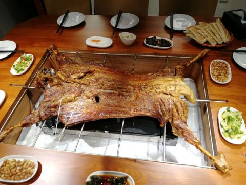 迪斯卡沃提前一天预订了他们家的烤全羊,他们家烤全羊需要烤制2-3小时,让我一直期待着烤全羊的美味~ 烤全羊,他们家是用宁夏滩羊肉,以肉质细嫩闻名,一只足够十个人一起品尝,上桌有仪式感,随着音乐上桌,使人融入到这个氛围当中,服务员会贴心的帮忙分好肉,只需要戴上手套,大口吃肉就可以了!烤的刚刚好,外皮酥脆,肉质细嫩入味!吃起来超过瘾的! 吃完烤全羊,别忘了还有旁边的火锅可以品尝,羊肉汤头鲜甜,搭配各种涮菜,十分不错~ 总体来说,他们家非常的不错,环境好,菜品同样出色