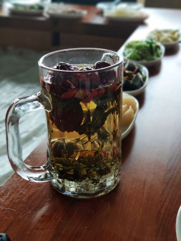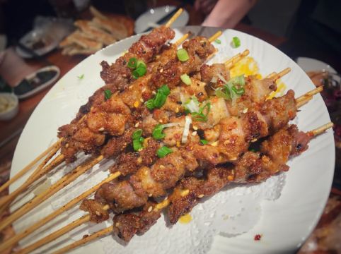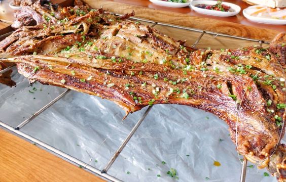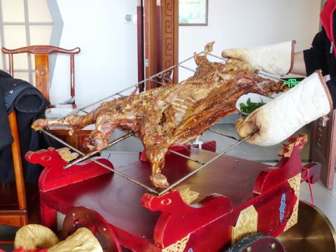 一直在路上的猫美食探店-我的520,带着羊肉味; 地址位于和平码头的2楼,有地方停车,但是今天要吃烤全羊必须来点啤酒,所以不开车; 环境:宽敞明亮,有盆景和小水车,包间很大,有泡茶桌、烤羊桌和吃火锅的圆桌; 餐品: 一只烤羊可供十人食用,从宁夏空运四十五天羊,一点膻味都没有,肉质细腻鲜甜;烤得皮酥肉嫩带油脂; 这种时候就算是女生也不可矜持,撸起袖子直接上手,大块撕下羊肉羊腿大口吃肉大口喝酒; 羊腿的瘦肉比较多,羊排部分比较肥,最爱羊皮,已经烤的非常酥脆,一点也不油腻,特别香; 完整的保留了两个羊腰,需要进补的先下手为强; 觉得腻的就搭配点小菜,甜蒜和生蒜都很过瘾,还有清爽的凉拌黄瓜和西兰花,酸甜的腌萝卜; 服务员贴心的把羊油剔一点下来夹在锅盔里面,让原本就外皮酥面香的锅盔更加美味; 吃到这里已经非常尽兴,但接下来还要转战圆桌,乳白色的羊汤加了天麻和文蛤,养身好喝,烫点丸子和菇类青菜等,还有羊杂,此刻太满足; 我的520,虽然没礼物,但有一帮好友一起吃烤全羊喝啤酒,惬意!