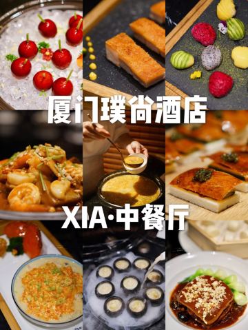 ⛩位于厦门市湖里区槟城道 277 号的厦门璞尚酒店 ,中餐厅取名为厦门的“xɪᴀ厦”,为了回应本土文化,返璞归真的都会桃源,整个餐厅的室内设计共使用了65万片红砖,仿佛来到了纯粹的红砖艺术馆。   ⛩红色的弧形空间里,充满秩序感的楼梯让人印象深刻,犹如红砖艺术馆内陈列的装置艺术。中庭自然的气息,设计的张力,此刻,无限美好,有种难以言状的奇妙乐趣,平和的空间内,一半是诱惑,一半是惊喜!   厦中餐厅为宾客开启富有中国传统文化的美馔之旅。同时融入了闽菜、川菜和粤菜的特色,别具一格的餐飨体验。餐厅餐具也是专门订制的,由于是手绘,盘碗上的荔枝树都不太一样,非常精致。   黑松露脆香素鹅 肉食者也钟爱的素菜,新鲜的菌类以假乱真,以炸后的腐皮包裹新鲜的菌类替代鹅肉的口感,再加入黑松露酱调味,外酥里嫩。全素的一道菜与这家酒店设计带来的氛围毫不违和,舒适、自然。   新会陈皮牛展 选用了十年的陈皮和牛腱子肉,肉质很嫩,味道却有点像牛肉干,有一种吃零食的快感。   果木烤黑黄金片皮鸭 是这里的招牌之一,用馒头片衬底,大片的鸭胸肉上还撒着鱼籽,鸭皮烤至金黄酥脆,非常好吃。   爆炸饭 吃前要有仪式感,掀开盖子倒入炒制过的米,只听见噼里啪啦的声响。浓郁金黄的汤汁,浸泡着米粒。入口有着脆脆的口感,仿佛米粒在舌尖上欢腾跳跃。   还有这里的龙云驾雾,很难想象我居然在粤港澳以外的地方能吃到这么好吃的小笼包,绝对五星推荐。   其他推荐菜品:红酒樱桃鹅肝、晋江酸辣汤、同安封肉、闽南海蛎煎等。