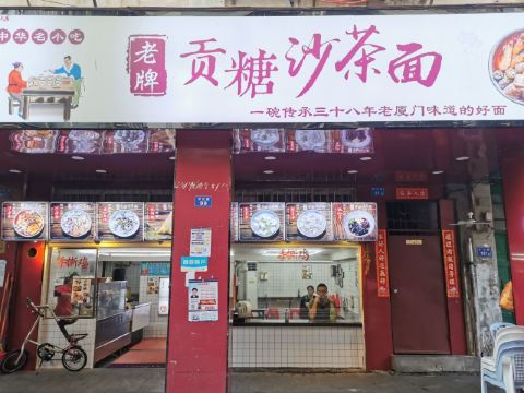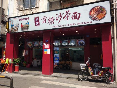 拜耳逛吃贡糖沙茶面,之前在西林附近的分店吃过,印象最深的就是加料时可以选择沙虫。 · 【店名】贡糖沙茶面(厦门总店) 【地址】开元路99号一楼 【交通】最近的公交车站是轮渡邮局,附近还有brt开禾路口站 · 🏠店里环境明亮通透,不像其它小店那样脏乱而且干净整洁。 · 🍜招牌的贡糖沙茶面,吃了好几次了,水平稳定。烫完的沙虫外观变得十分白嫩,口感甜脆,和绵柔的沙茶汤头简直是绝配。 · 🐔手撕鸡 黄澄澄的手撕鸡皮肉相间,再加上一些蒜泥和香菜,香气四溢,令人食指大动。 · 5️⃣五香条 很经典的闽南小吃,外皮很脆,整体吃起来觉得软硬度适中,而且特别香。后面用的甜辣酱也很正宗,比自己家里吃要好吃。 · 🥚海蛎煎 传统的厦门小吃,我记得自己小时候比起海蛎汤更爱吃海蛎煎,然后现在更是特别爱吃。这份海蛎煎的蛋比较少,满满都是海蛎,吃起来太满足了。 · 👍🏻从店内的宣传板上了解到几十年前沙茶厨艺新老传承的故事,从中不难发现这样一碗沙茶汤头有多诱人。