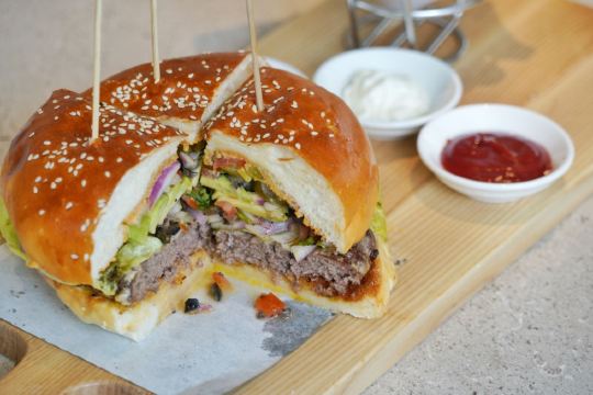 旅行美食家抹茶糖立方,有多少人是被她可爱的店名欺骗了,你以为是甜品店,其实不止可以下午茶。Sugar Pavilion糖立方,可以吃一天的约会餐厅。 “比脸大”牛肉汉堡配炸薯条,真的超大一个的,大饼脸都没它大!均等切成四等份,最多可供4人食用,小女生吃个四分之一就有半饱了,份量超足!内陷有牛油果、番茄、生菜等新鲜蔬菜,以及厚实多汁的现煎牛肉饼,足足有一两厘米厚!!鲜嫩多汁,另外还配有炸薯条,三种蘸料,各具风味。 他家意面也很好吃,酱料咸淡适中,搅拌均匀,且面条兼具意大利面的软嫩与劲道,好吃不贵,会上头。 环境有室内位和室外位,在午后的阳光下,有种意大利小镇的悠闲风情,依然自然,慢生活的小资情调。