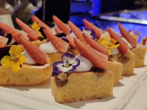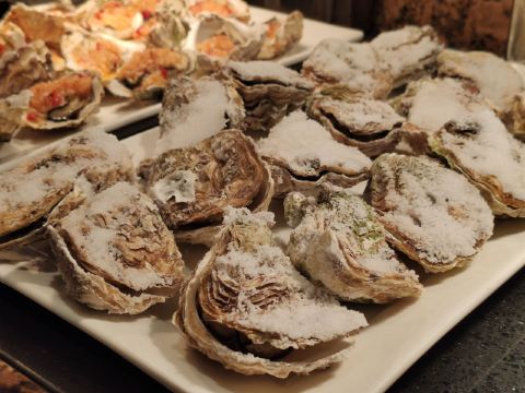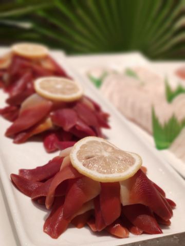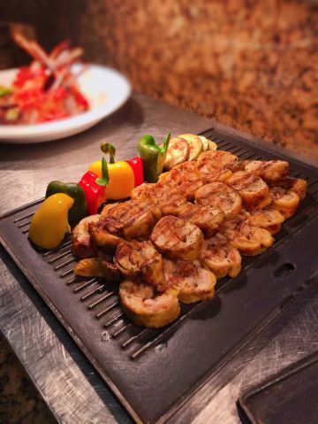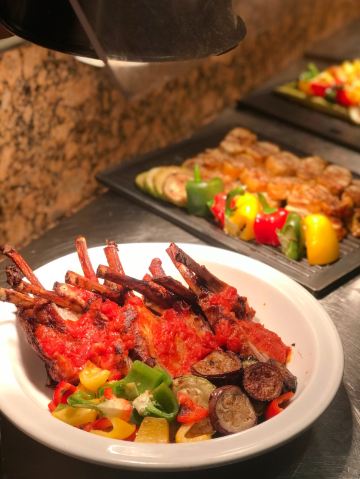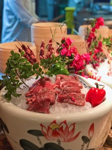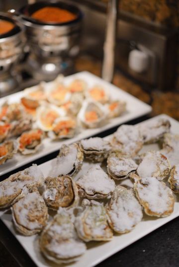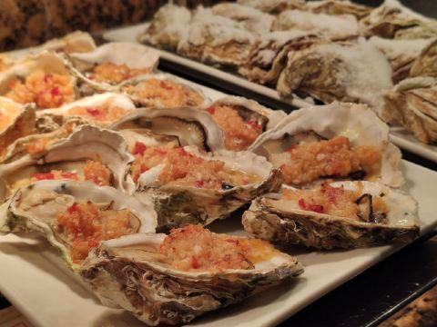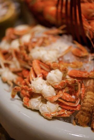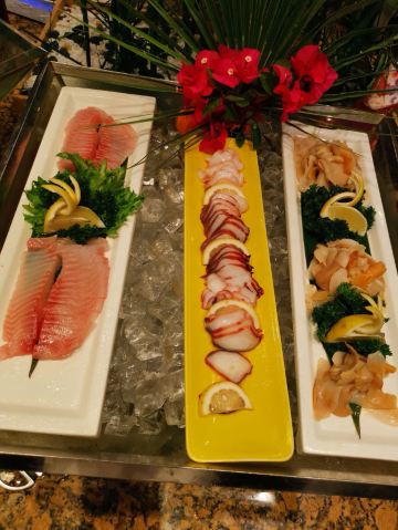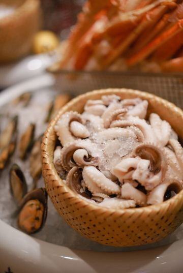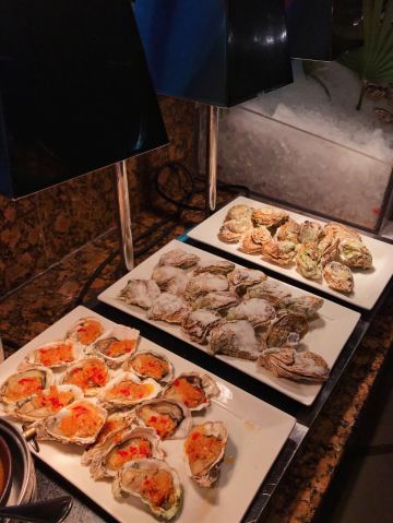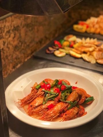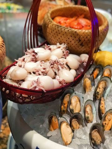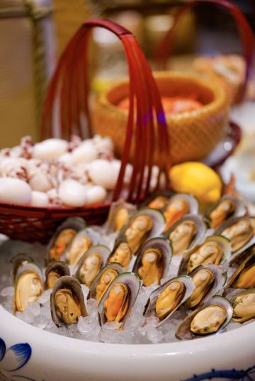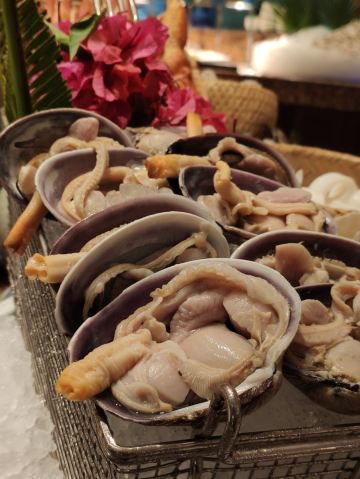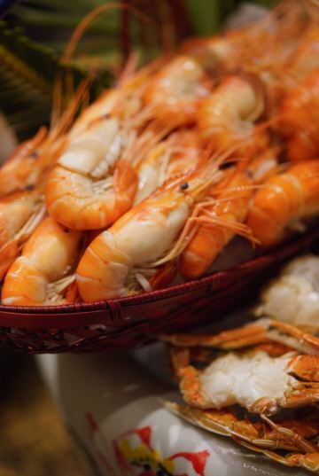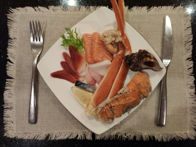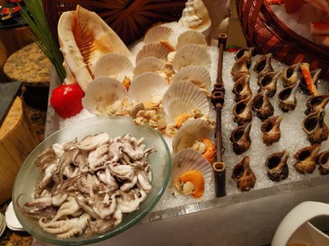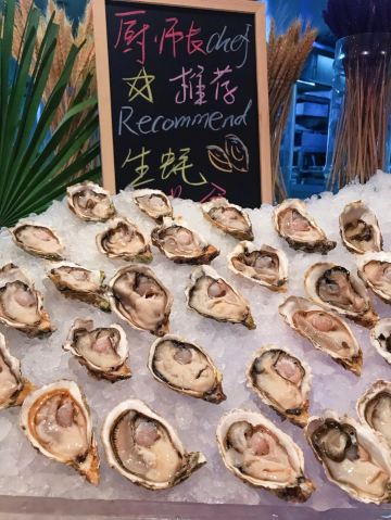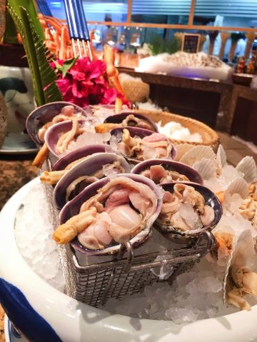 T骨牛排,佛跳墙,扇贝,黑蒜烤生蚝,北极贝,羊排,哈根达斯,甜点,生鱼片,焦糖布丁,蒜蓉粉丝蒸扇贝,寿司,刺身,龙虾,花生汤,大虾(红虾),港式茶点