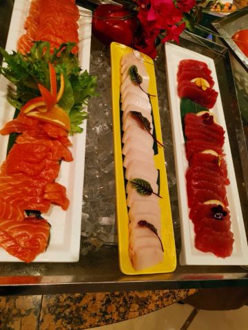 澎渝滟悦华酒店自助餐已经是去过N多次了,而且经常做团购性价比很高,最近酒店在做海鲜饕餮盛宴主题,只做为期十天的豪爽海鲜宴哦!对于超级热爱海鲜的人怎能错过,约上臭味相投的两闺密飞奔而去,个人建议选择晚上去更好,一是有时间慢慢品味喜欢的各种美食,二是晚上相对来说美食种类更加丰富,相比中午多几十元远远性价比是高出好多倍的! 喜欢悦华自助主要是在钢精混泥土的城市里这里有一方安静宽阔的自然空间,可以包场户外室内的小型聚会环境是非常有档次! 自助餐厅在大堂进来左手边二楼,一进入就开始眼花缭乱,最大的海鲜餐台尽收眼底,直奔主题,让我眼睛一亮的就是刺身区里的北极贝,嫩红新鲜,很多自助餐都没有北极贝的今天看来可以吃到满足啦!再来就是生蚝了,进口生蚝四种吃法,刺身,蒜蓉,盐焗,清焖,最爱刺身口感清甜,还有就是大闸蟹膏黄饱满吃完还配了特制的姜茶祛寒,甜品区当然最爱哈根达斯啦,吃饱喝足还能再来的甜品非她莫属,团购249元的自助简直是还想再来一趟!强烈推荐哦!