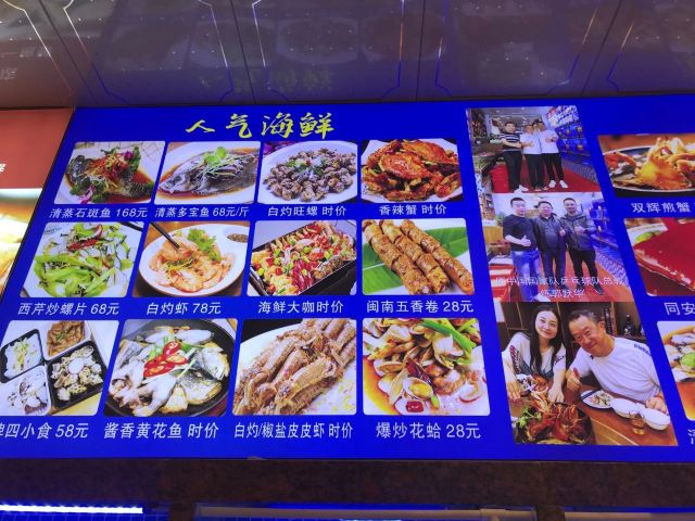 清蒸鱿鱼,海瓜子,酱油水鱿鱼头,红烧丝丁鱼,海蛎煎(小份),椒盐梭子鱼,皇帝鱼,小鲍鱼,海蛎煎,土笋冻,杂鱼酱油水,大竹蛏,海鲜,炒花蛤,地瓜叶,米粉,炒面线,海蛎紫菜煲,馅饼,同安封肉,炸醋肉,花蛤酱油水