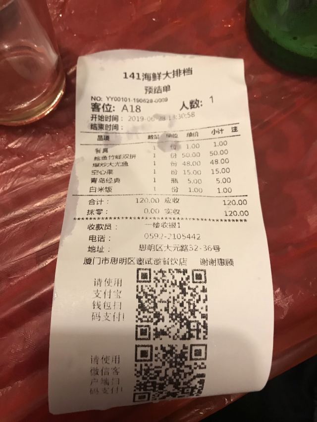 Kaiyuan141haixiandapaidang(DaYuanLuDian)鱿鱼够鲜,一个人吃撑完,3个人吃就刚好,要双拼的海鲜实惠,可以吃两样非常好,服务员介绍的,不然点单独的就不划得来了,结账还有西瓜吃送的,老板很有礼貌,厦门人真好。下次再来游玩 【口味】