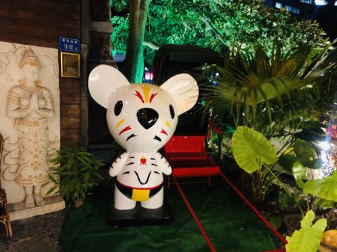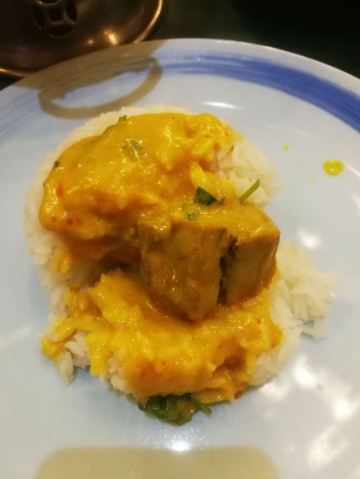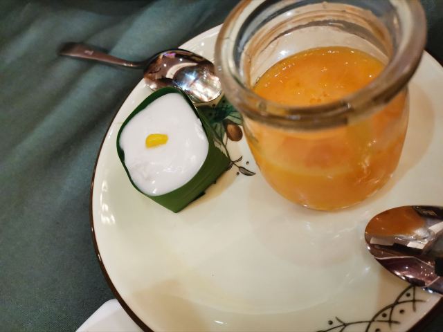 许fan【地址】就在莲花南路站附近,下车后步行150米左右。 [薄荷]环境:市中心15年的老店,从门口就可以感受到小桥流水,而且挺有东南亚风情,连服务员的服装都挺有特色的,店面还挺大的,位置也挺多的。 [服务铃]服务:服务很贴心,要入座还帮我们拉椅子,点菜是扫码点菜,贴心之处在于点甜品时有让我们选择马上上,还是等通知。店里还有专门的材料展示区,泰国香米和咖喱酱料都有卖。 「芒果青」这是送的,酸酸甜甜,很好吃。 「无骨凤爪」点的是一例,其实就是小份,但是份量足,酸辣口味,特别开胃。 「黄咖喱鸡肉」点的是一例,适合2-3人,咖喱味道很纯正,而且黄咖喱很浓郁,上桌点火,确保边吃边保持热度。热热的咖喱淋到米饭上,米饭Q弹,拌着咖喱特别香,而且里面还有鸡肉和土豆,鸡肉很嫩,土豆很松软,份量大。 「冬阴功肥牛汤」必点菜,冬阴功汤不是那种纯酸的,加了香茅,很香,肥牛+金针菇特别赞。 「巧克力布丁」挺特别的,据说是用古法做的,店员还担心我们吃不惯,但其实个人觉得挺好吃的,巧克力味道也很浓郁。 最幸运的是最近正好遇到中秋佳节,店内消费每桌可以博饼一次,结果我一博博到三红,超幸运的,开心🥳