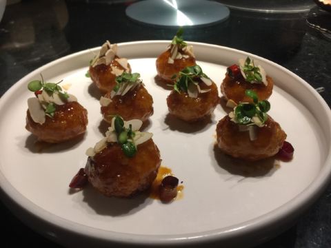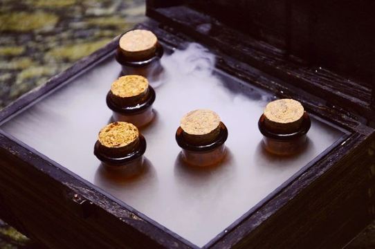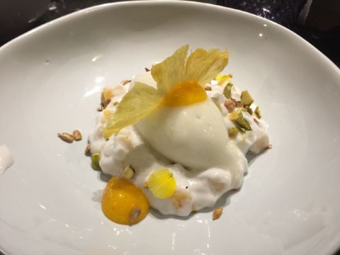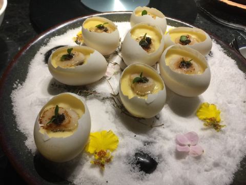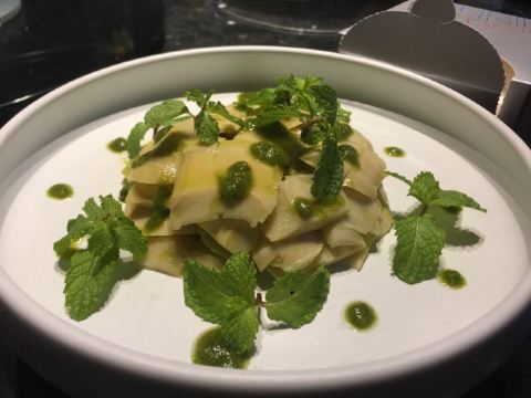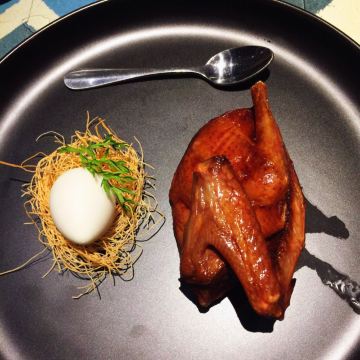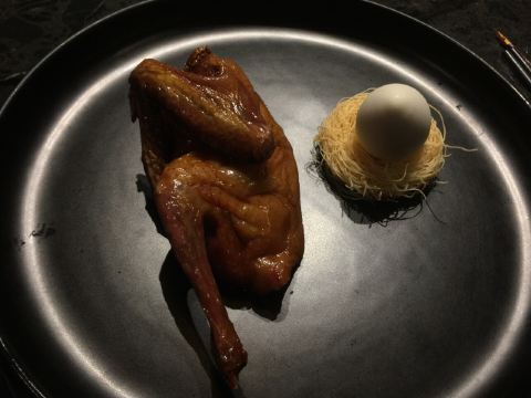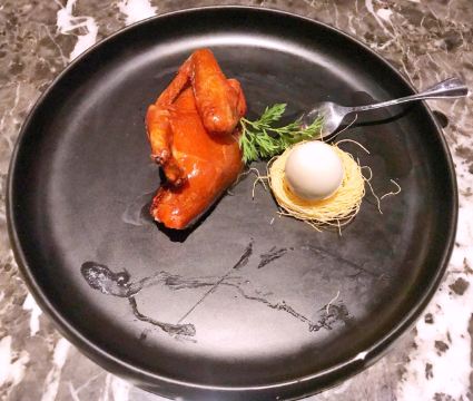 young-liu服务很好,一进门就有服务生引导,一路走过碰到的服务生都会问好,让客人体验到尊贵的感觉。 开始上菜,首先是餐前饮料,宴遇一直以菜色精美、创意著称,饮料也不例外,装在一个古色古香的木箱子里,很是神秘,打开一看,仙气涌动,里面放着几小瓶饮料,其中有一瓶是苦瓜汁,其他的是百香果汁,拿到拿个就看人品啦! 樱桃鹅肝吐司,细腻香醇的鹅肝酱放着香脆的吐司上,一起送入口中,味道好极了。 香草烟熏安格斯小牛肉,牛肉放在滚烫的铁板中端上桌,牛肉散发着诱人的光泽,牛肉很嫩,口感很棒。 厦门土笋冻,这是闽南的知名小吃,做的很正宗地道,胶质丰富,口感Q弹,酱汁调配的也很棒。