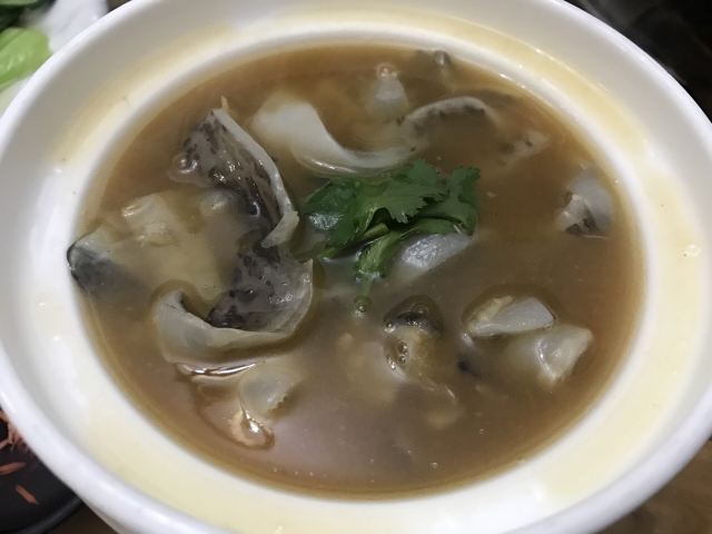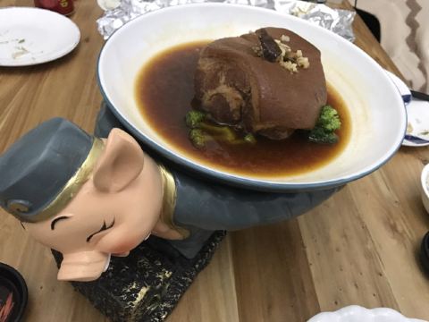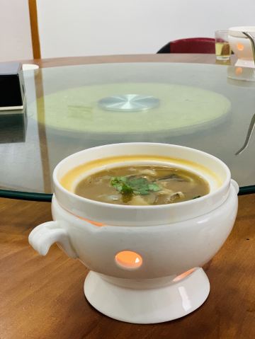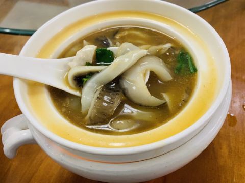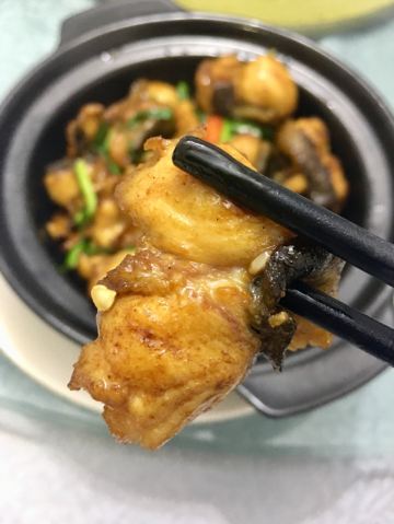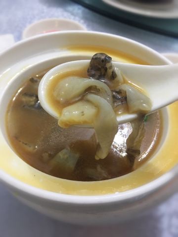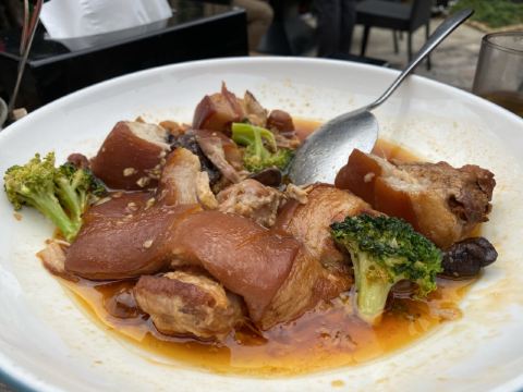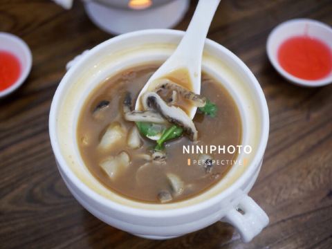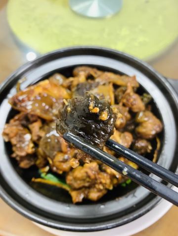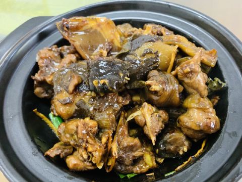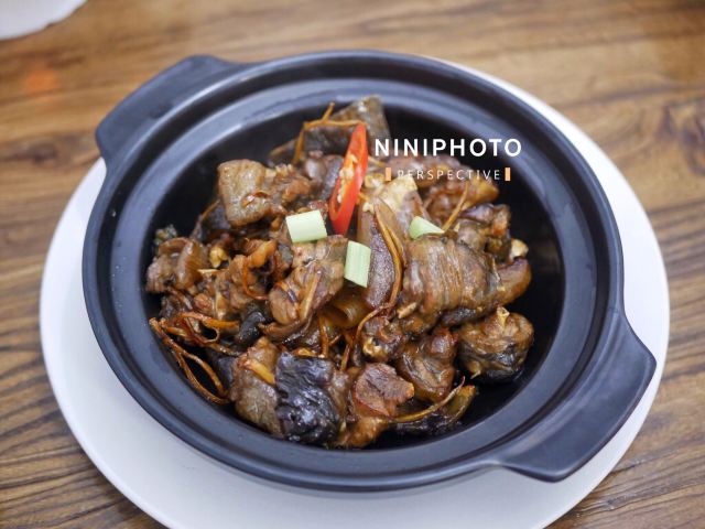 Chow.Chow.在有院子有鱼池的粉色独栋房子内...店内基本上都是包厢设计...稍微看了一眼...大多都是10人以上的包间... 早有听闻这家是出了名的“野味店”...有机会都需要来尝尝...俺来吃了一顿美容餐... 「红烧甲鱼(原创)」[害羞]从小很爱吃甲鱼...多是煮汤...还是第一次吃红烧的...味道特别赞诶...非常下饭...满满的胶原蛋白...胶质很多...都被焖煮出来了... 「干捞鲨鱼皮」店内招牌...依然是满满胶原蛋白...但是我一开始不知道要加入红醋搭配着吃[流泪]就直接吃了近一半...总觉得比较腥...问了店员才知道原来是需要加红醋去腥...加了红醋之后...口感确实不同了...腥气也没了... 「上汤枸杞叶」枸杞叶时下非常流行的肉汤辅料...还是见枸杞叶被当青菜来吃...还不错... 「手工褒美芋泥」依然是店内招牌...芋泥+一点咸蛋黄+桂花甜酱...绵密好吃...