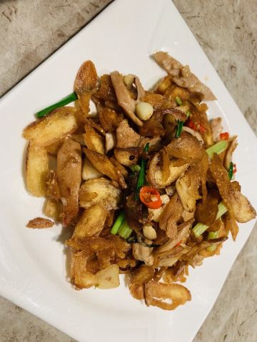 今晚吃点啥?全靠轩公子翻牌,想吃小龙虾的心蠢蠢欲动了起来,那就离家不远的上湖居吧。上湖居主打武夷山私房菜,忽然想起那年特意去五夫镇看莲好似昨日。🤓 🍀环境: 两层沿街店面,一层小桌二层包间大桌,装修简约朴素。 🍽菜品: 蒜香小龙虾🦞,照顾轩公子吃不了辣,点了蒜香口味。🧄蒜蓉真是一种有趣的佐料,生一点口感辛辣脆爽,混合在龙虾中煮熟一点口感变得绵密汤头清甜却也保持了蒜香。小龙虾洗得很仔细干净,虾肉紧实弹牙!剥壳后留下虾球,夹些许泡面,虾汁混合着蒜蓉淋在泡面上,完美配搭!👍 木桶滑牛肉🐂,这道菜真心强烈推荐,可下饭可配酒。牛肉烹饪时加入香叶和胡椒粉,肉质鲜嫩爽滑,藏在牛肉下的鸭血豆腐滚烫入味,食用时定要小心哦!😲 光饼大肠🥠,不要惊讶,这个组合绝对是闽北菜最具代表性的菜肴之一!光饼油炸至金黄,大肠切成条状,加入姜大蒜辣椒旺火翻炒。光饼香酥可口大肠油而不腻,黄白相间好似金片玉块。 💁🏻♂️服务: 店里清一色的小哥服务员,热心有礼,为食客准备了一次性围裙和手套,比心!♥️
