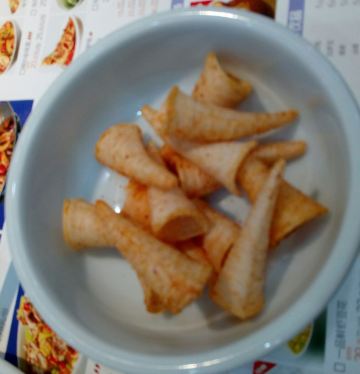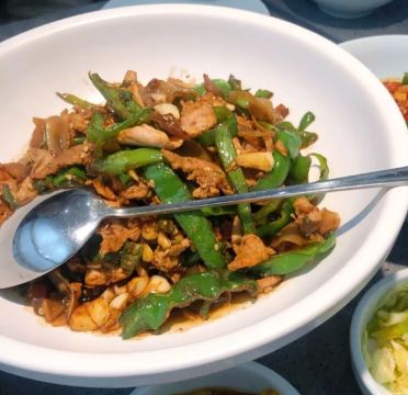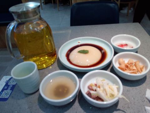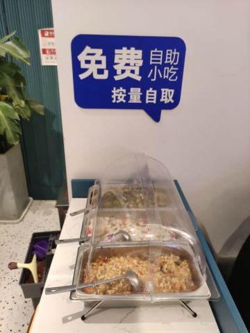 [薄荷]环境: 在中贸二楼,楼梯口有发单员,指示路线,蓝色招牌也很醒目,老远也可以看到。 店内干净整洁,凉爽。 【口味】 店里的自助小吃也相当不错。有冰粉,妙脆角,还有花生米,酸菜。另外,米饭都是用小电饭煲直接上,方便。