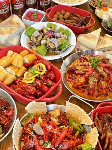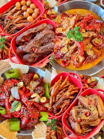 龙虾抓油条,勾魂麻辣小龙虾,捞汁小海鲜,火爆辣鸭舌,冰镇梅渍小番茄,麻麻辣鸭头,神仙蒜蓉小龙虾,激情椒香牛蛙,藕遇,解辣酸奶杯