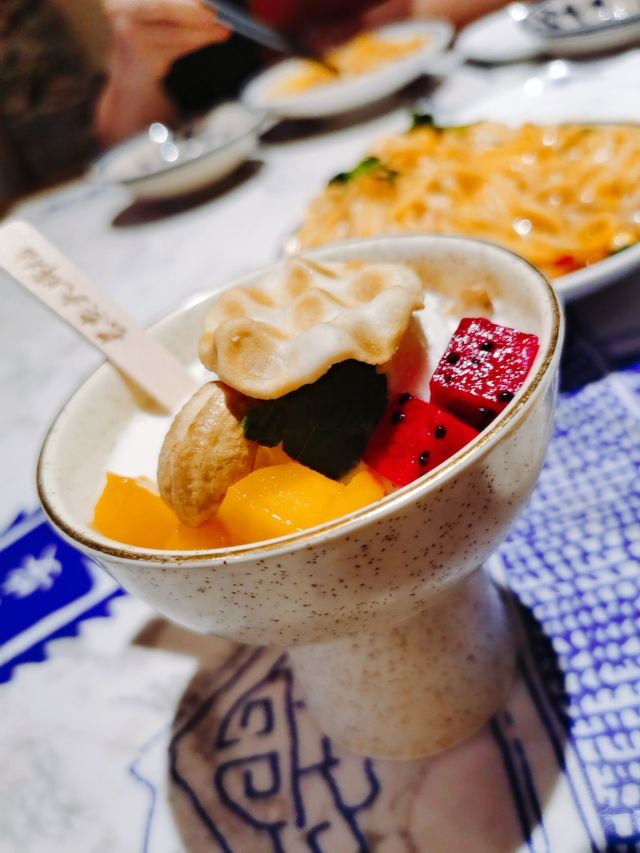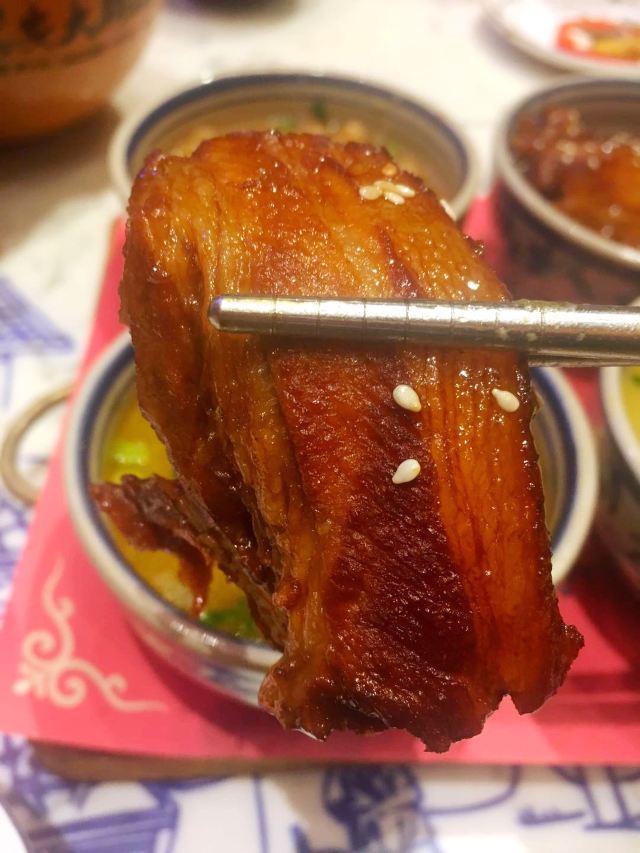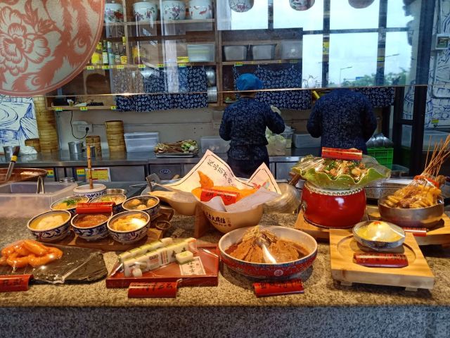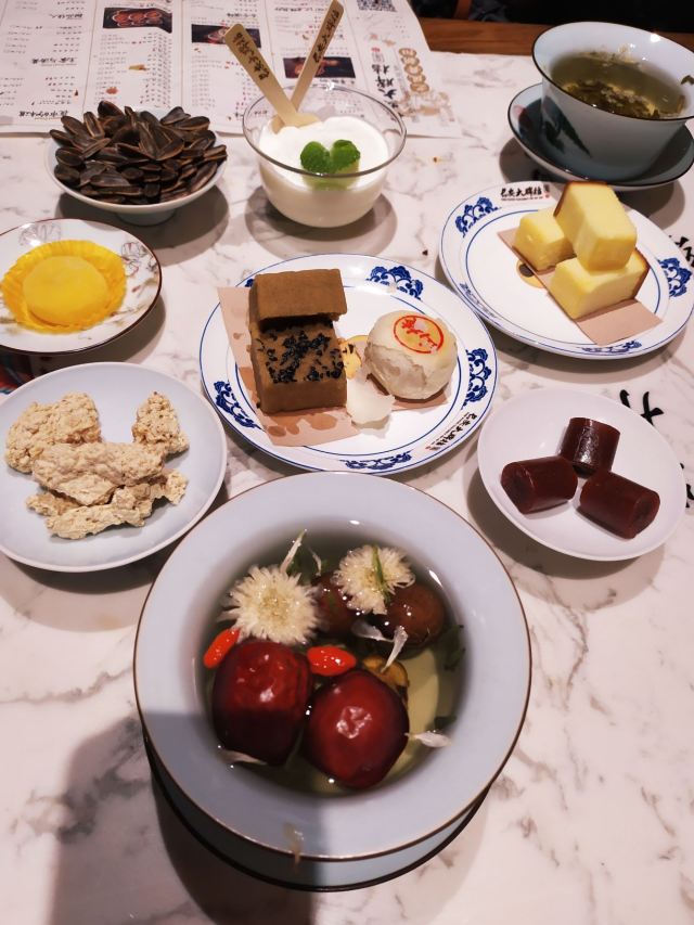 作为十三朝古都的西安,是陕菜的代表城市和发源地,陕菜既有精雅的高档菜,又有普通的中低档菜。来西安吃陕菜的特色店就是长安大牌档。在西安市内有几个分店,我每次每次都是去的长安大牌档(凤舞朝阳店)。 这家门店位于益田假日世界购物中心西侧,门面复古,黑底金字店招,整体环境非常古典优雅,而且挨着古城墙、钟楼很近。他家的陕菜真的太丰富了,推荐下:葫芦鸡、豆皮涮牛肚锅、冰草酸奶沙拉、烤筋、面皮捞牛肉、毛笔酥、麻将十三幺、民间烤枣馍、关中六小碗、油泼辣子鱼、一口香臊子面、桂花绿豆凉糕等。 其中最具代表性的就是葫芦鸡,始于唐代,做工复杂,分清煮、笼蒸、油炸三道工序,保存鸡的完整性,呈金黄色,皮酥肉嫩,香烂味醇,沾点辣椒面更有味道。 酱烧大龙骨 食肉者必点。酱烧大龙骨一端上来就阵阵飘香,不得不说酱汁已经完全渗入肉里面,味道浓郁,肉块软烂适口。 豆皮涮牛肚,酱香浓郁味道有点微辣,牛肚爽脆有嚼劲,搭配麻酱简直是绝配。豆皮很薄,尽管蘸满了麻酱也阻挡不了豆皮本身的香味。 蜂蜜绿豆凉糕,上面一层绿豆稠沙,再撒上芝麻花生,底下是软糯可口的糯米。蜂蜜的甜已经完全和绿豆稠沙融合在一起,口感可谓之丰富。