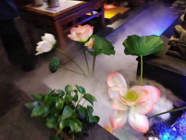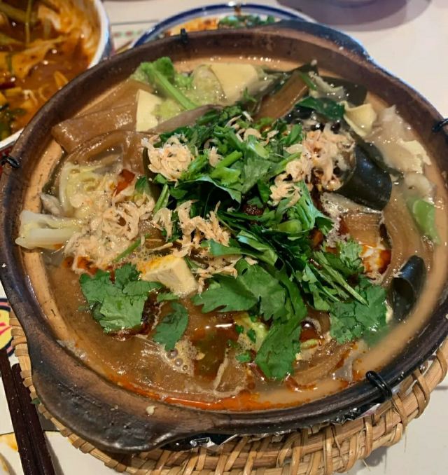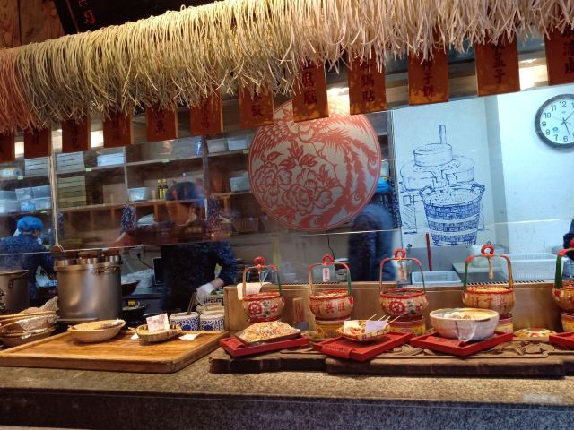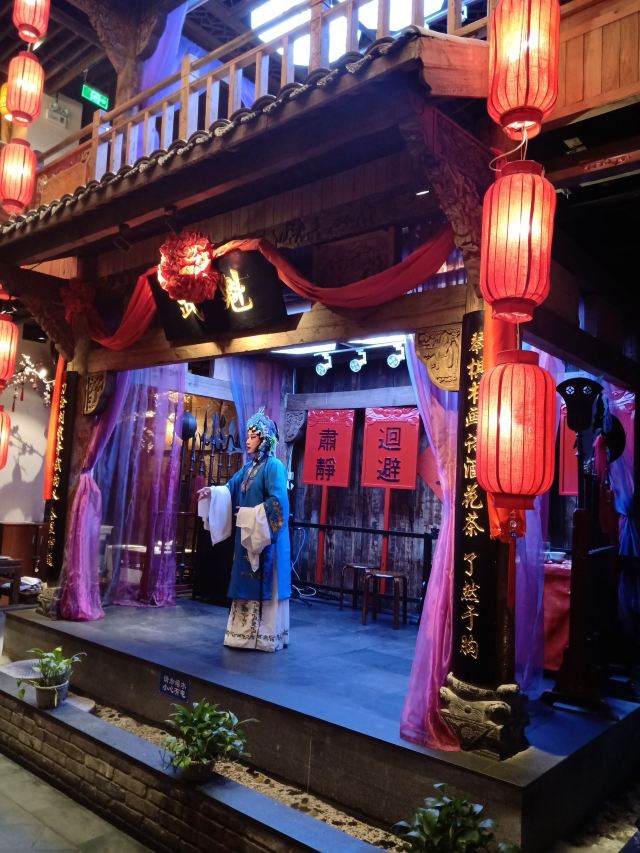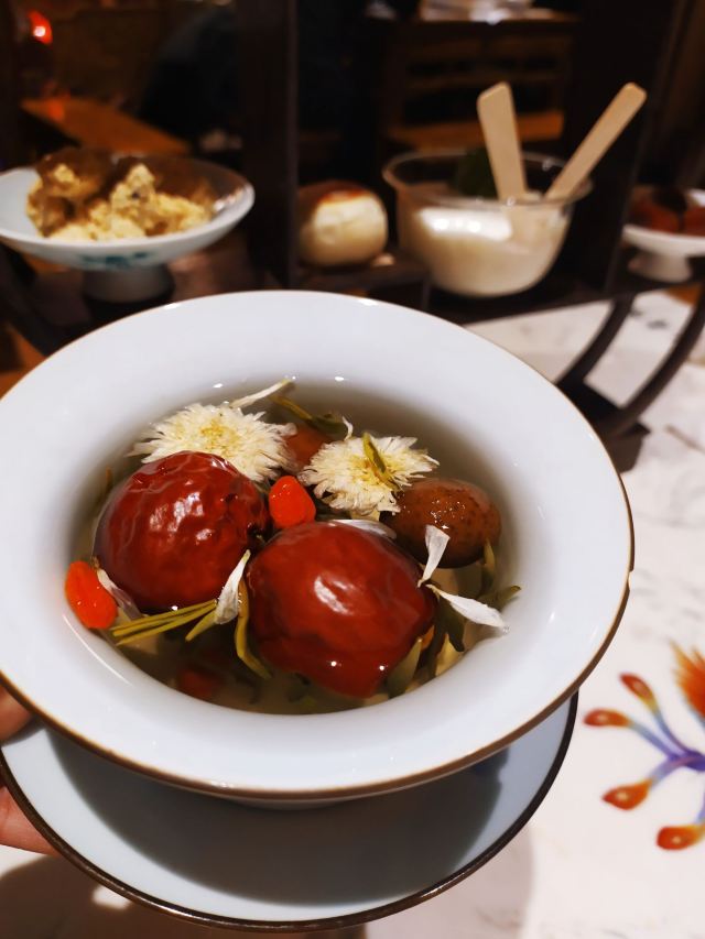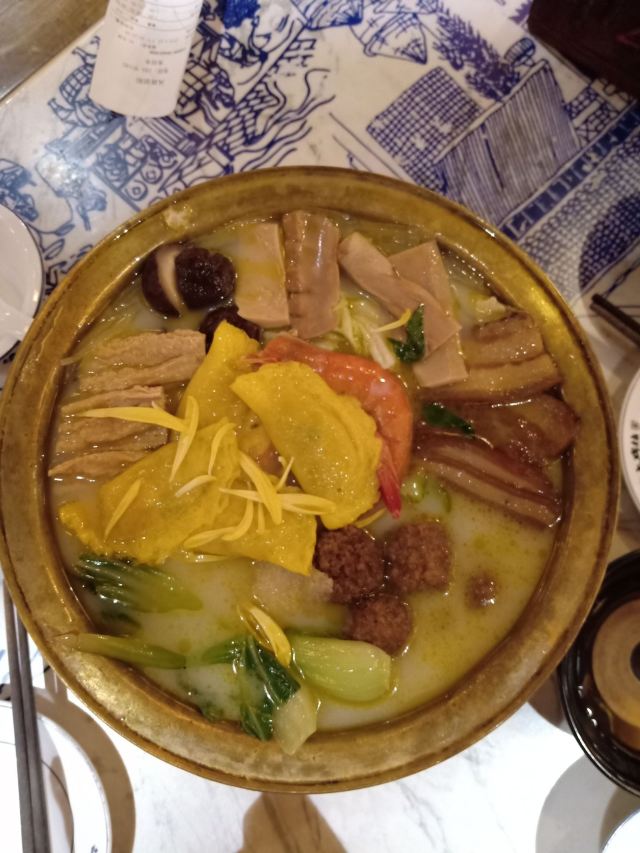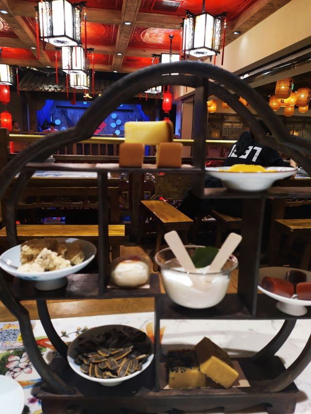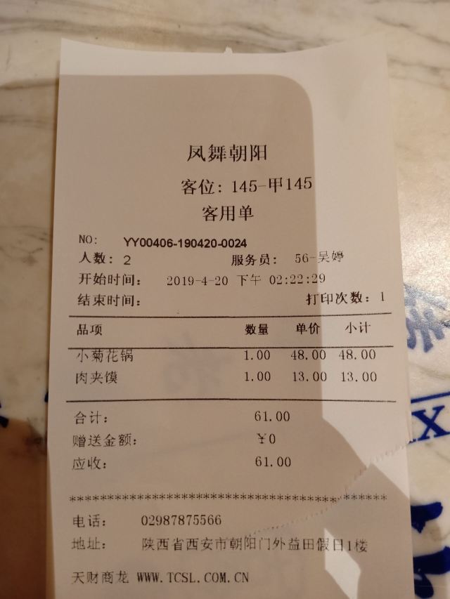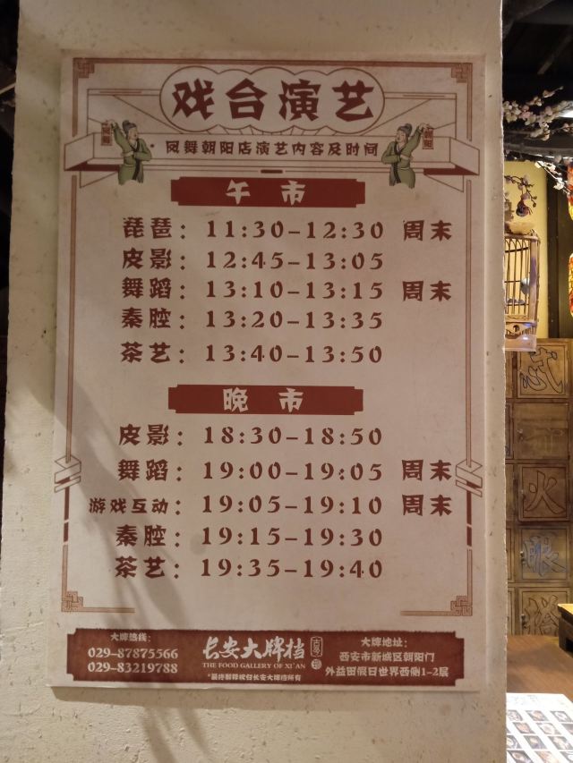 古藤幽兰冒雨来到长安大牌档的朝阳门店,因为实在太喜欢‘凤舞朝阳’这四个字,又不想排长队,果然如愿。进门后凑巧赶上了戏台演出秦腔,扮相俊美,不知道是不是真唱,戏台周围座无虚席,反正也不懂得欣赏,座位偏远一点儿也无所谓了。点单是件蛮头疼的事儿,人少饭量小,又不想浪费,真是不知道该怎么点,服务员也不催也不问,正好,慢慢选吧 。中途去厨房区转了转,果断放弃关中六碗,最后选了小菊花锅,想吃的大牌灌汤包竟然没有了,那就换成肉夹馍。两个人应该够吃了。抬头四望,这才发现周围空空了,哈哈 ,这是点了多久啊?肉夹馍,13块钱3个,迅速端上,真不大,看着蛮精致的样子,一吃,哇噻,香嫩无比,太好吃了,馍软硬适中,肉肥瘦正好,咬一口,鲜香酥软,非常满意。小菊花锅,略等了十来分钟吧,锅里面有洋白菜青菜腐竹香菇猪皮萝卜粉丝,另有蛋饺(3只)肉丸子(6)肉片(4)鲜虾(2),感觉食材真的很新鲜,口感鲜美,不油腻,吃到最后有点儿略咸,还好还好。不过,全程没看到菊花,可能是菊花汤?不管了。不知道算不算是正宗陕西菜关中菜味道,不过确实蛮好吃,菜量虽不是很大,饭量小的刚刚好,就餐环境及卫生都很好,餐巾纸三块一包,卫生间需要出门乘电梯上二楼。整体算是非常满意的一次美食体验。