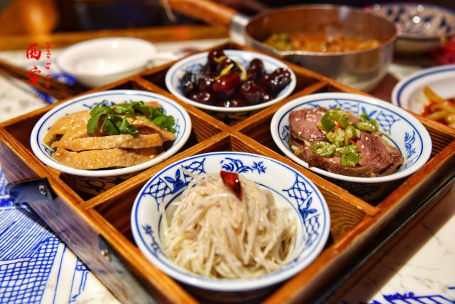麻将十三幺,民间烤枣馍,长安葫芦鸡,毛笔酥,妃子笑,醪糟冰淇淋,西府一口香,豆皮涮牛肚锅,关中六小碗,烤肉筋儿,油泼辣子鱼,手工面皮捞牛肉,葫芦鸡,冰草酸奶沙拉,烤筋,面皮捞牛肉,一口香臊子面,桂花绿豆凉糕,西安烤肉